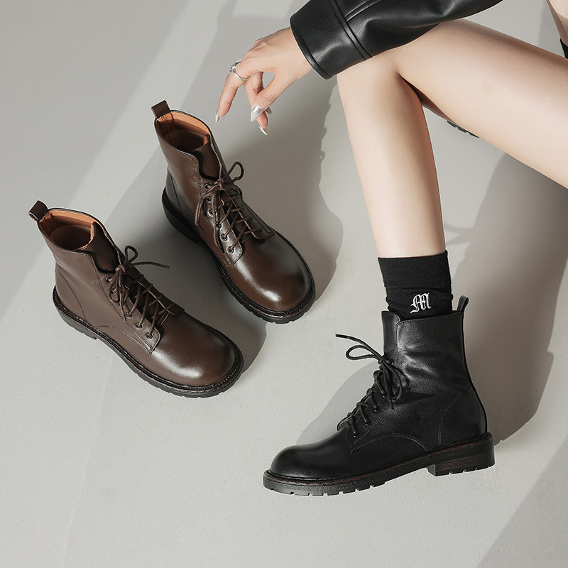 풀 탑 레이어 소 가죽 3cm 전면 레이스 업 마틴 부츠 여성의 2024 봄 가을 겨울 가죽 싱글 부츠 플랫 짧은 부츠 40