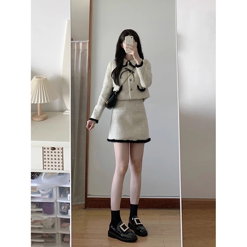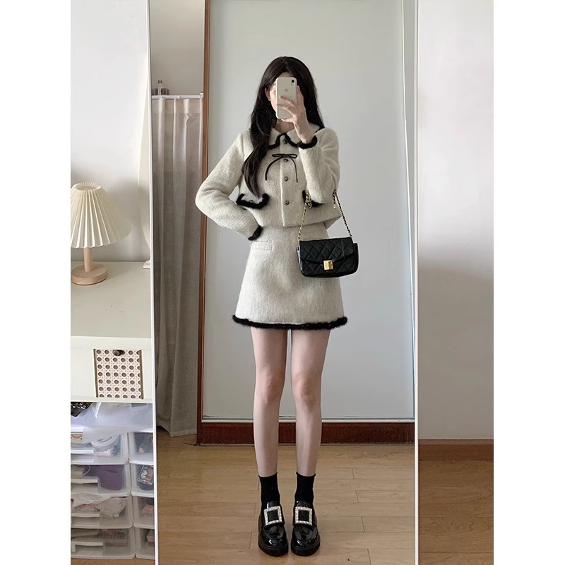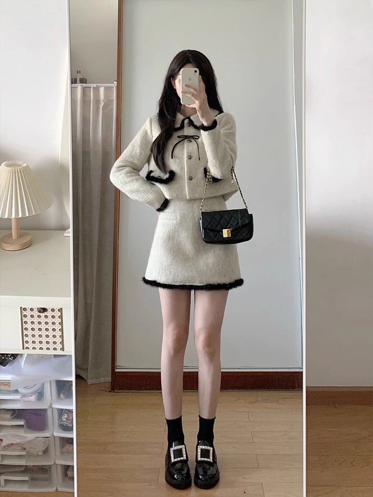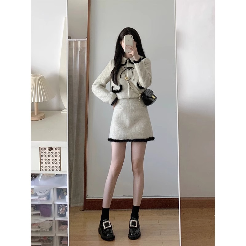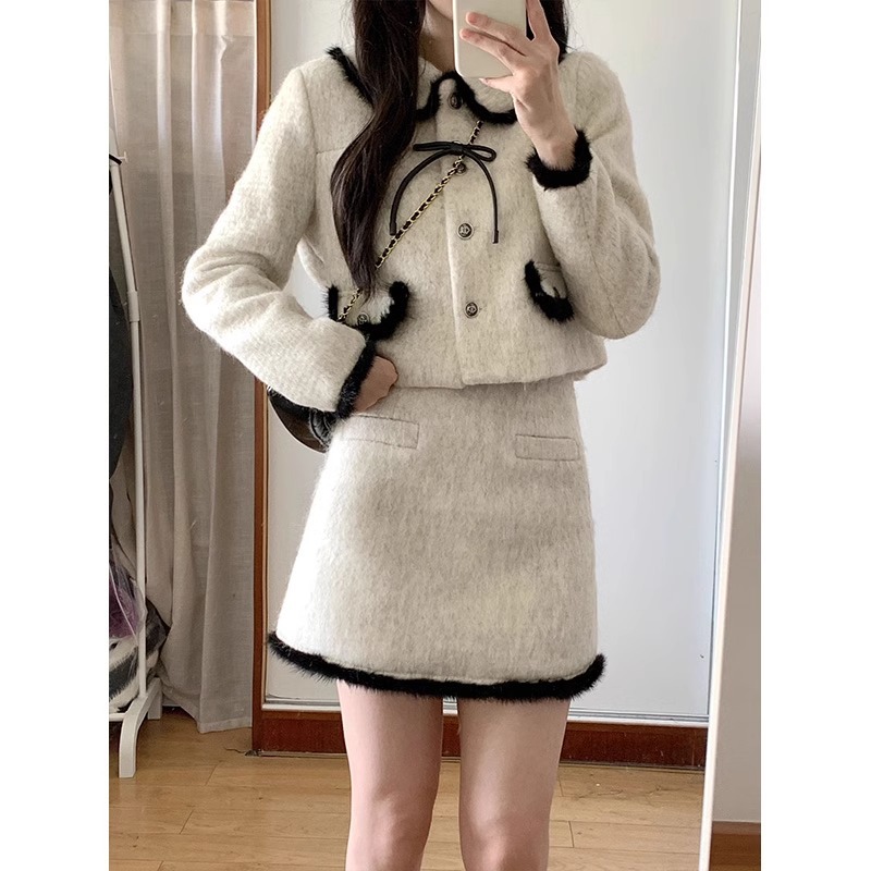 올해 인기있는 아름다운 세트 스커트 콘트라스트 컬러 울 코트 스커트 2 피스 깊은 겨울 원피스 여성 세트스토어 가기