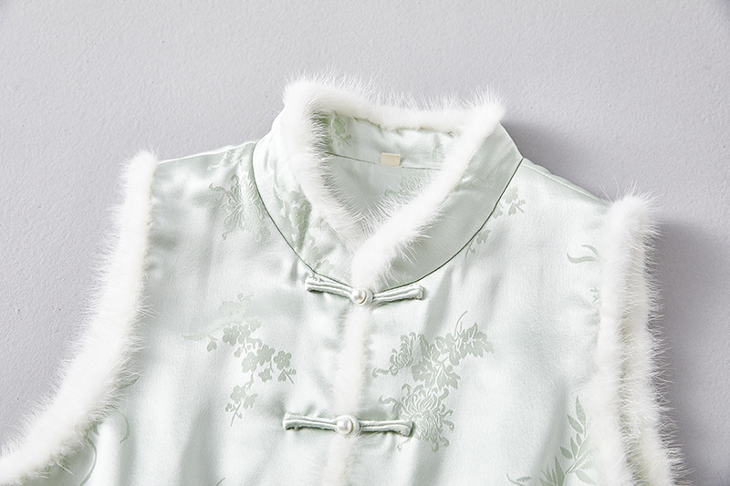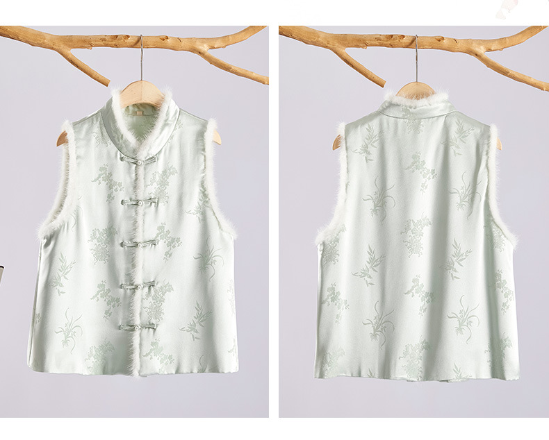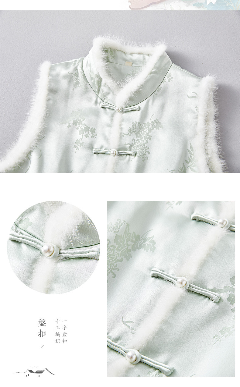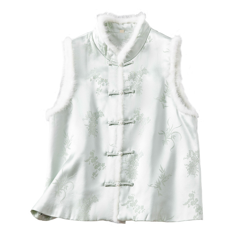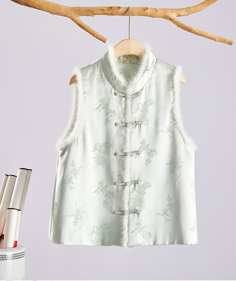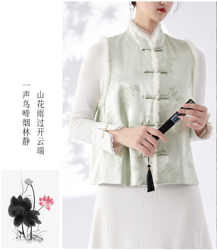 새로운 중국 스타일의 하이 엔드 티 의류 우아한 칼라 밍크 헤어 코튼 조끼 Acetic Acid Satin Jacquard Hanfu 조끼 여성 버클