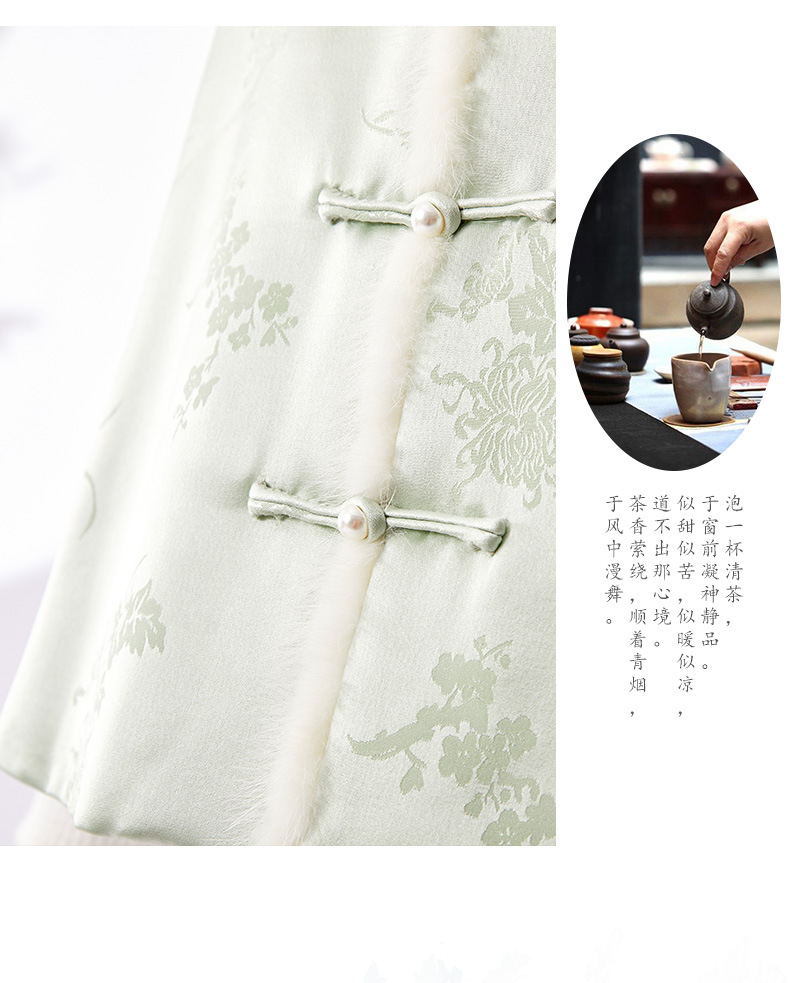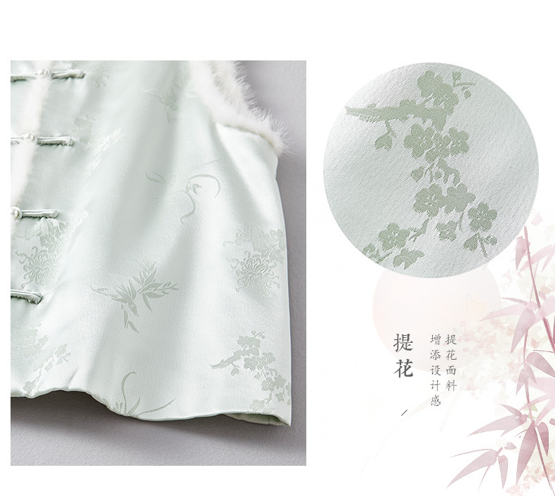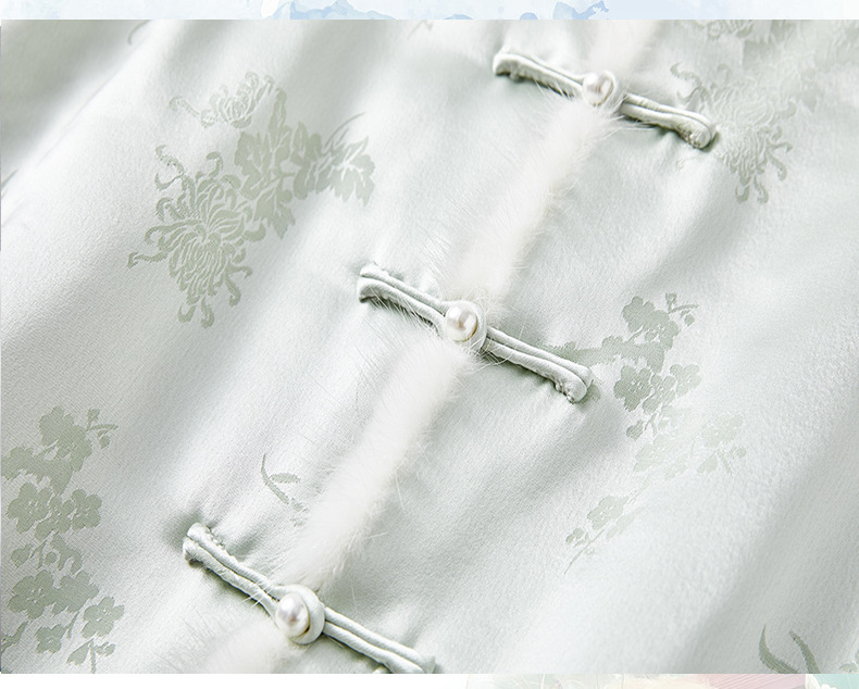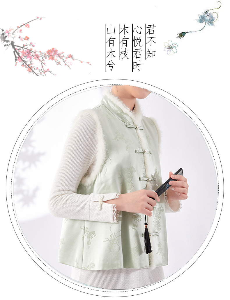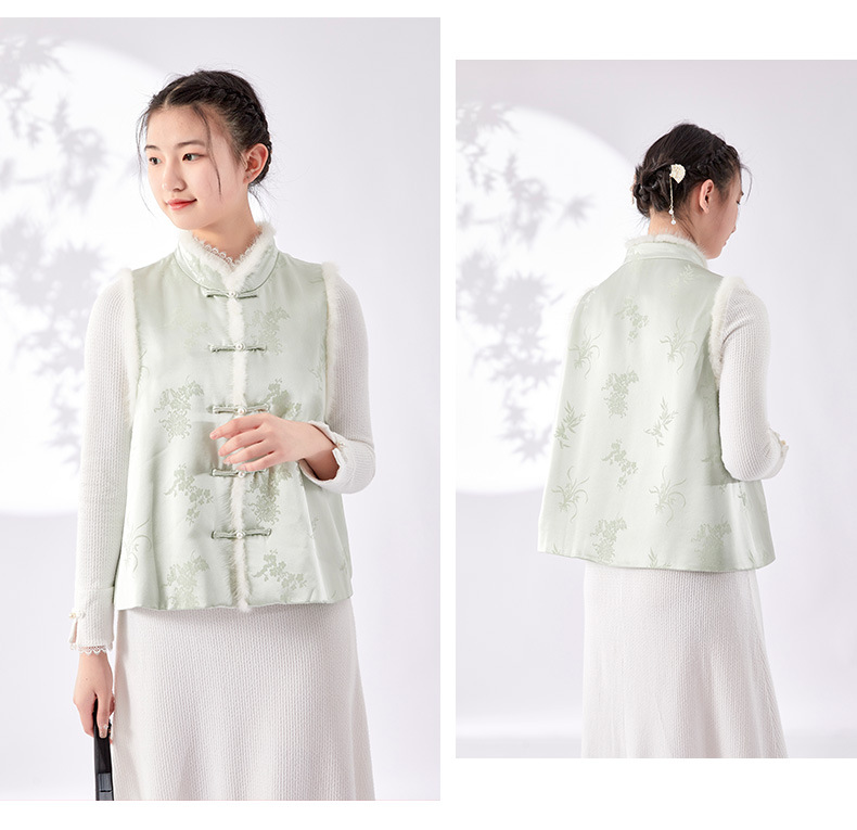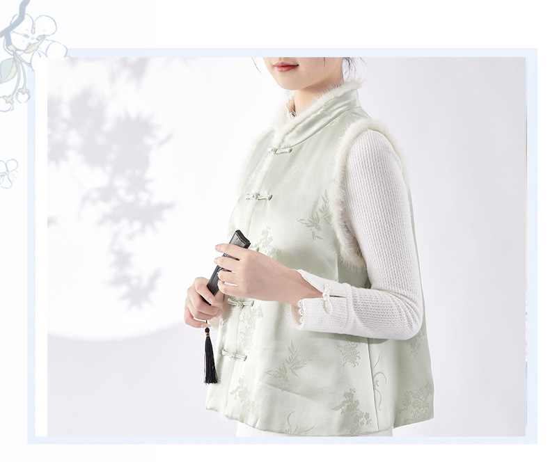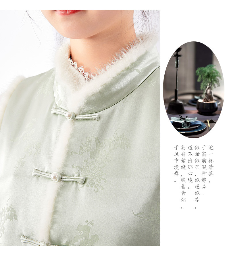 새로운 중국 스타일의 하이 엔드 티 의류 우아한 칼라 밍크 헤어 코튼 조끼 Acetic Acid Satin Jacquard Hanfu 조끼 여성 버클