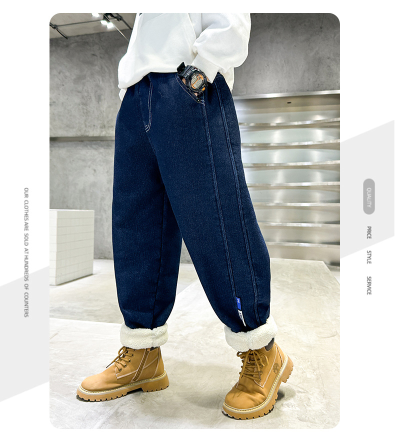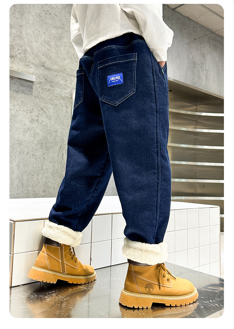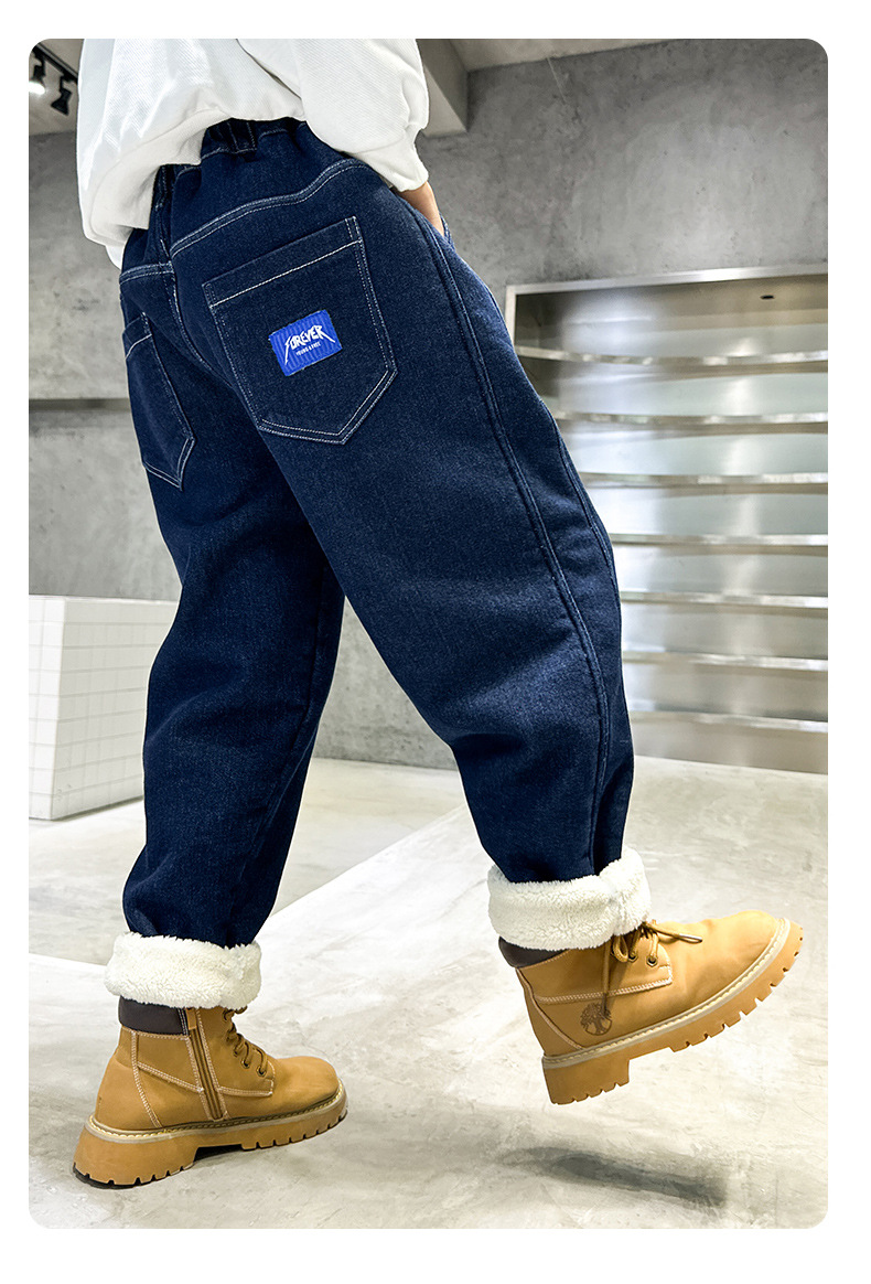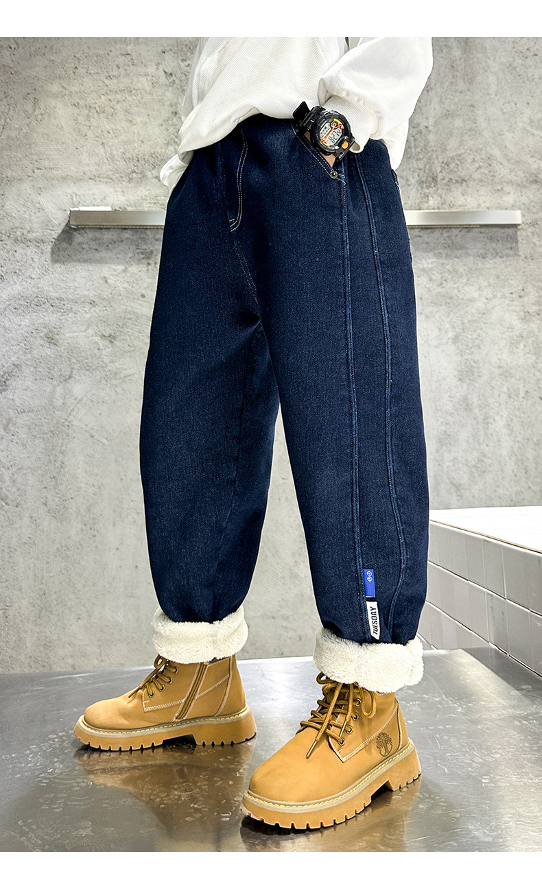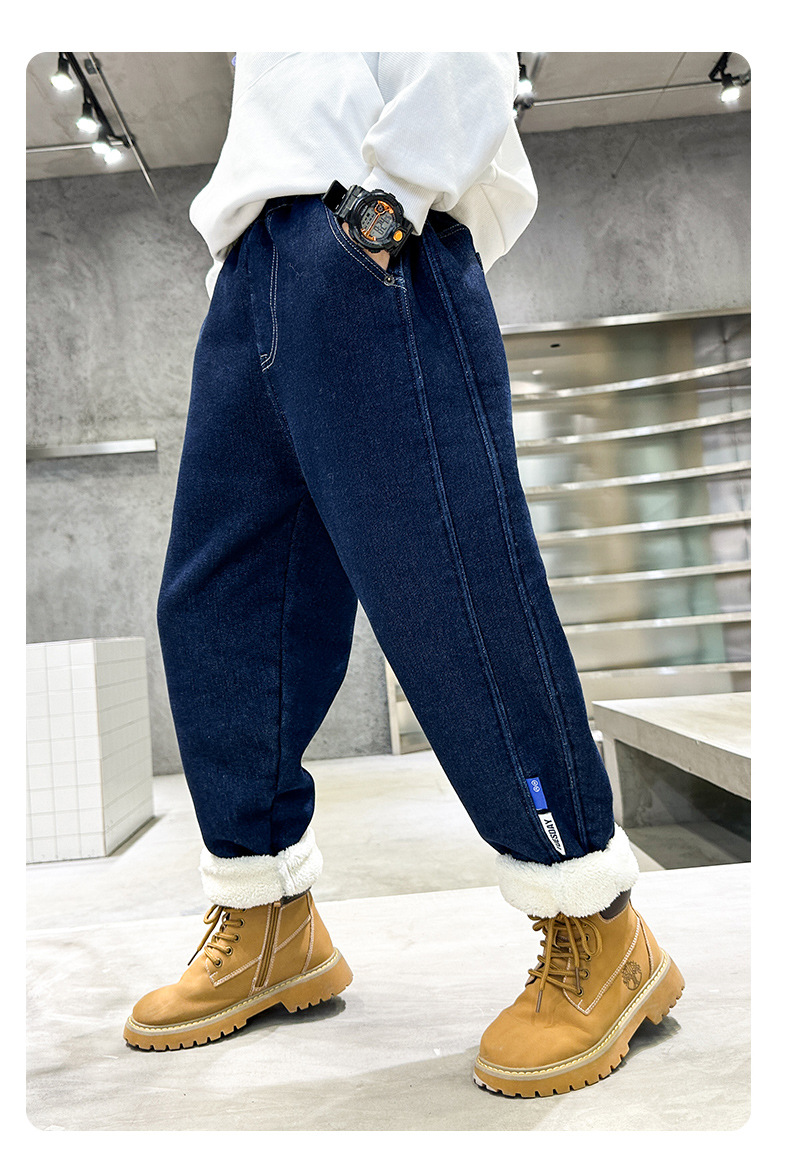 남아용 플리스 데님 팬츠 양털 겨울 바지 2025 신상 아동용 일체형 플리스 바지 두꺼운 면바지 트렌디