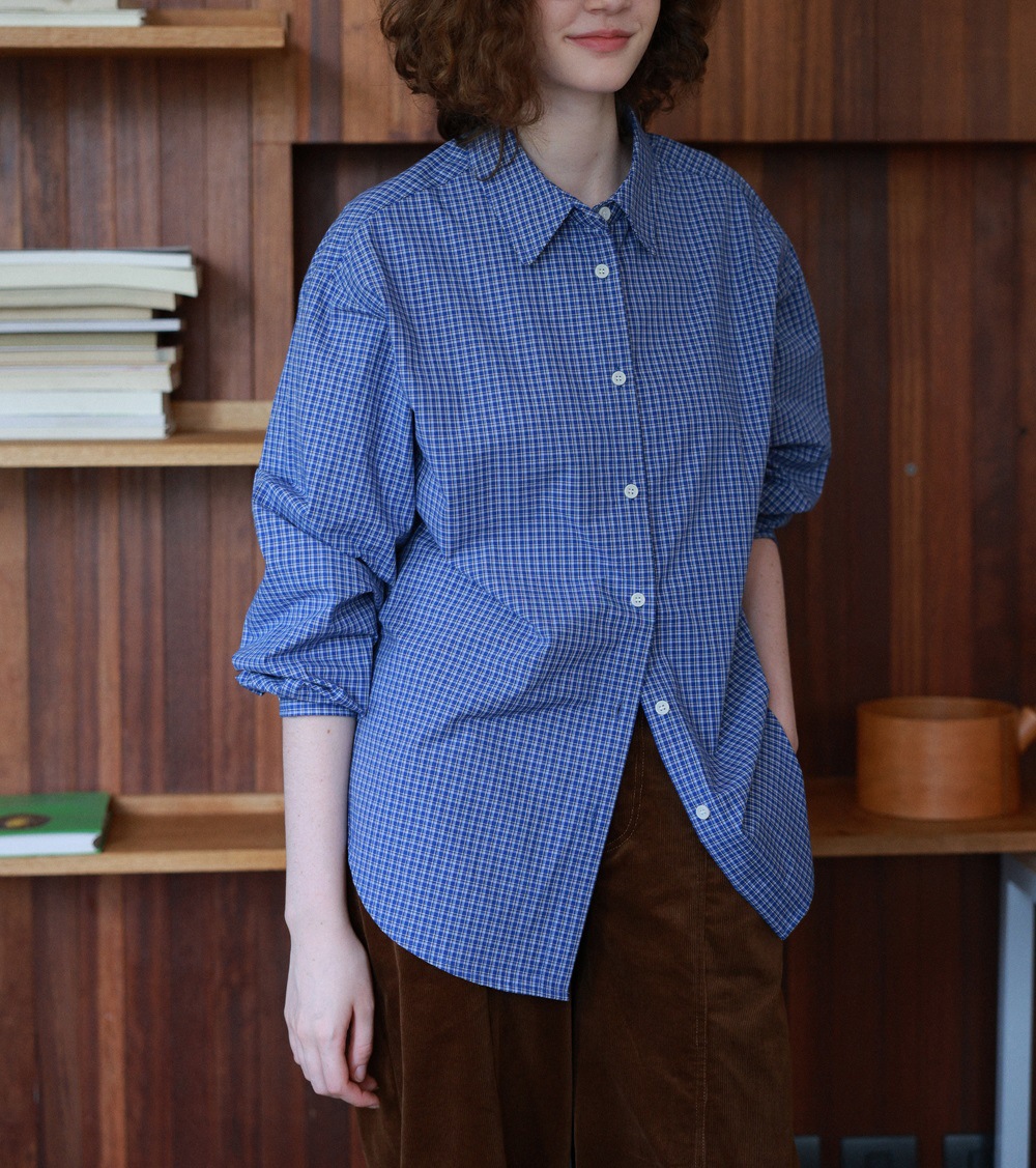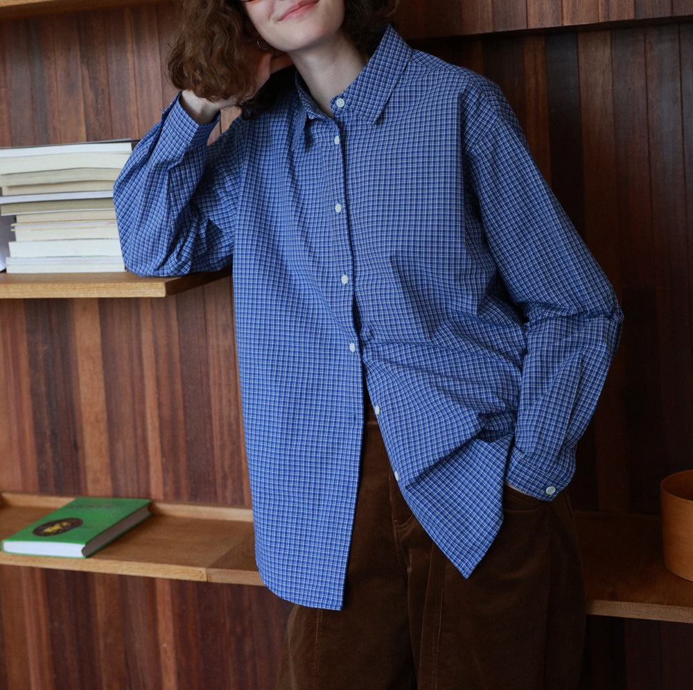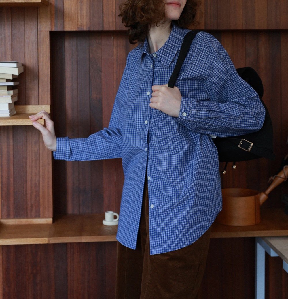 miu 시리즈' 체크무늬 클래식 프렌치 레트로 2색 블루 체크무늬 심플 봄, 가을 긴팔 셔츠스토어 가기