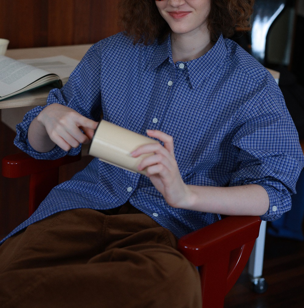 miu 시리즈' 체크무늬 클래식 프렌치 레트로 2색 블루 체크무늬 심플 봄, 가을 긴팔 셔츠