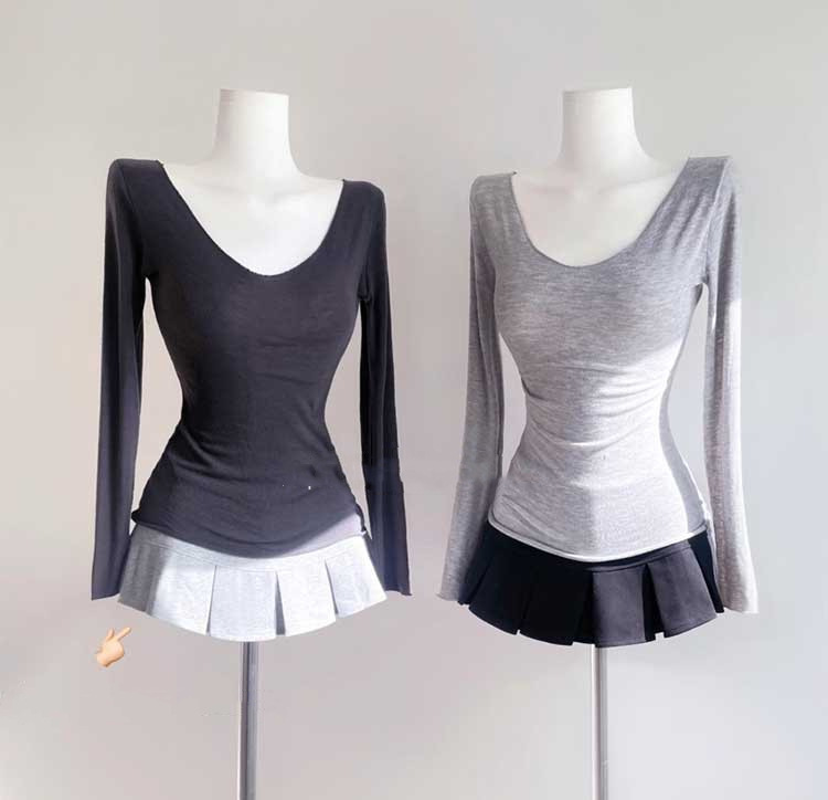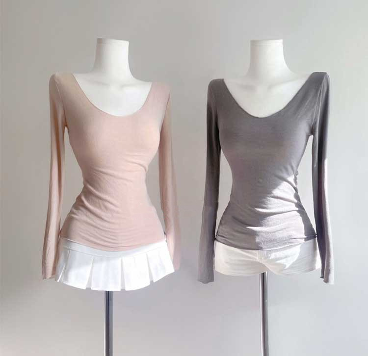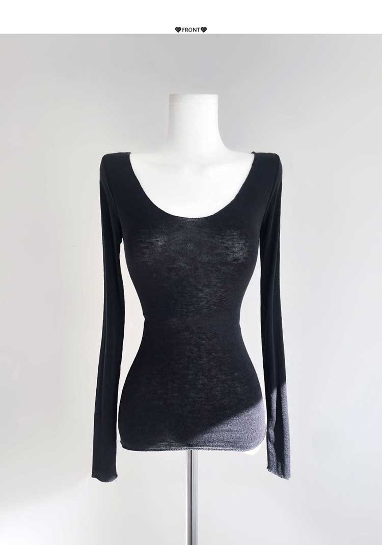 가을 새로운 라운드 넥 우아한 슬림 핏 얇은 마이크로 투명 탑 한국 스타일 가슴 공개 여성용 긴팔 타이트베이스 셔츠 티셔츠스토어 가기
