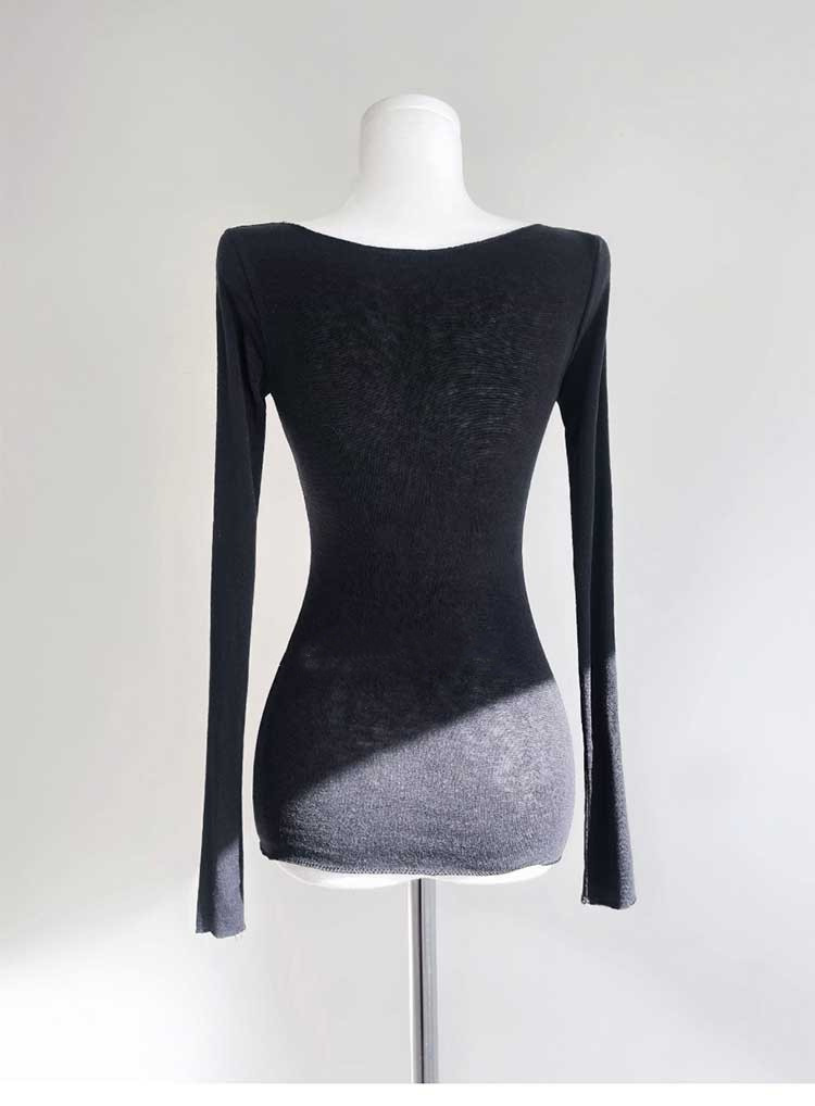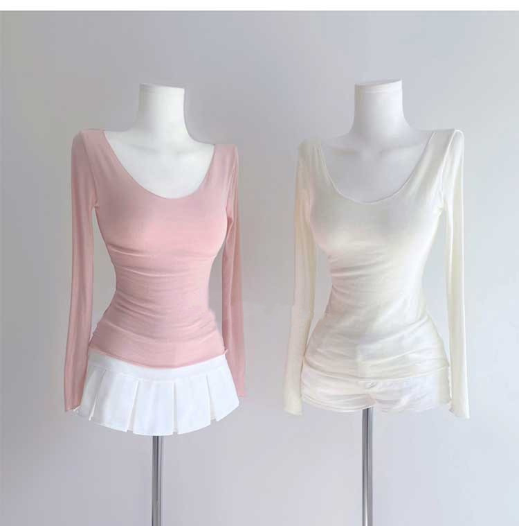 가을 새로운 라운드 넥 우아한 슬림 핏 얇은 마이크로 투명 탑 한국 스타일 가슴 공개 여성용 긴팔 타이트베이스 셔츠 티셔츠