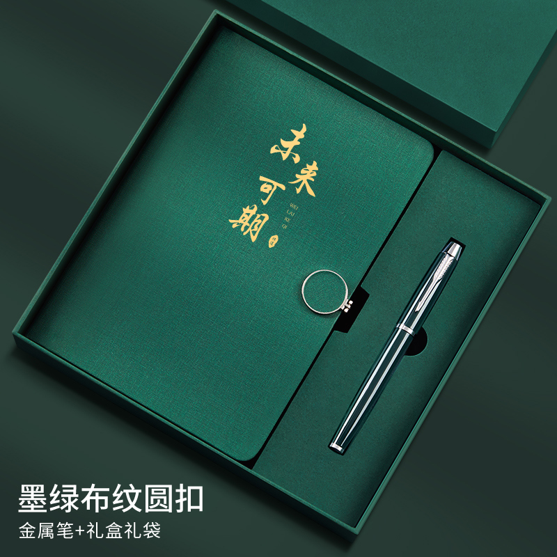• 유망한 미래 - 짙은 녹색 천 패턴의 둥근 버클 + 금속 펜 + 녹색 상자