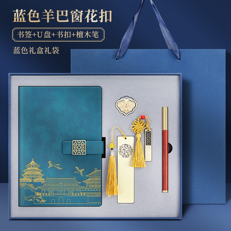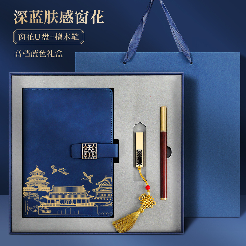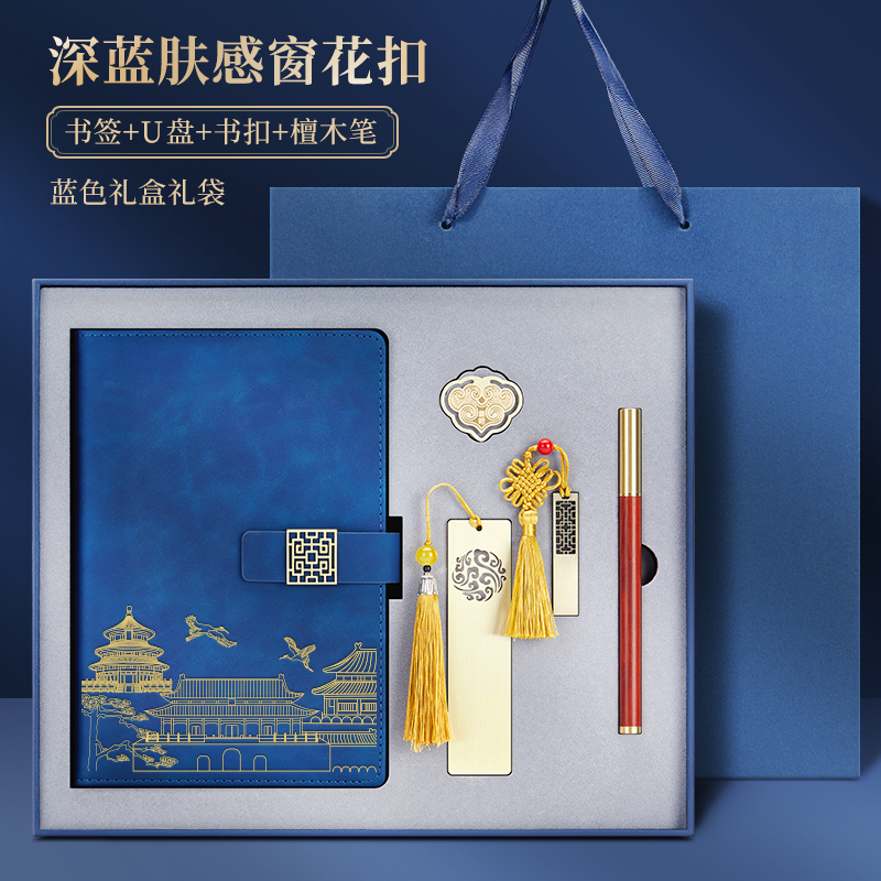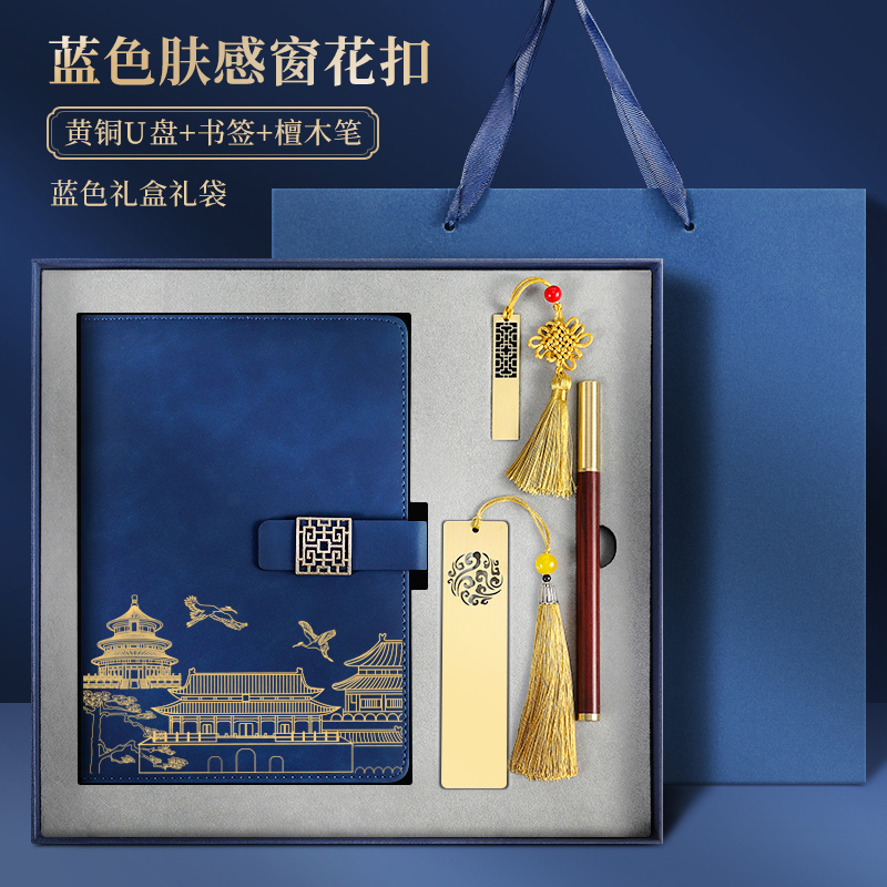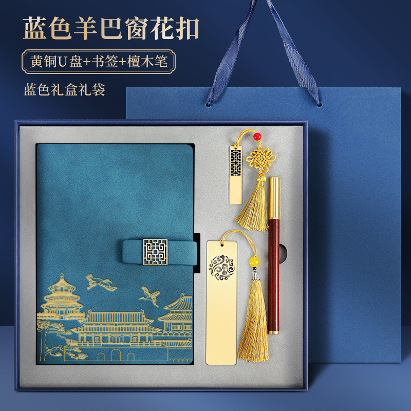 • 자금성 진한 파란색 피부 느낌 창 그릴 + 창 그릴 U 디스크 + 황동 책갈피 + 책 버클 + 백단향 펜 + 고급 파란색 선물 상자