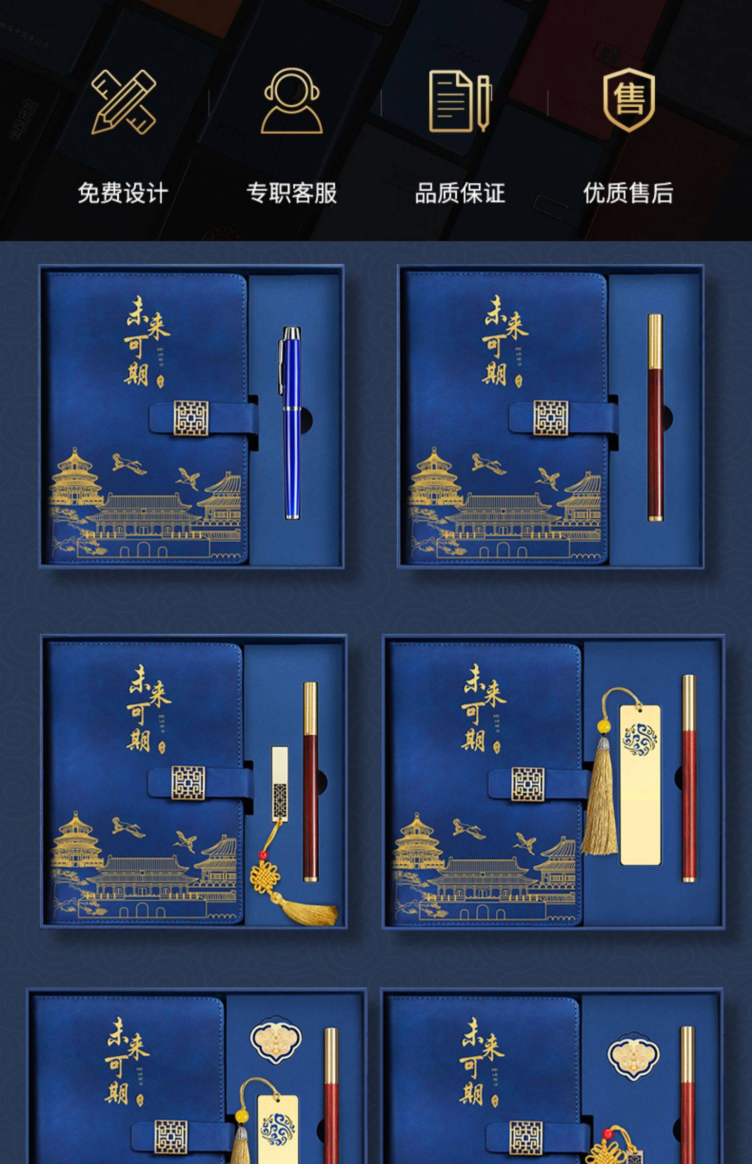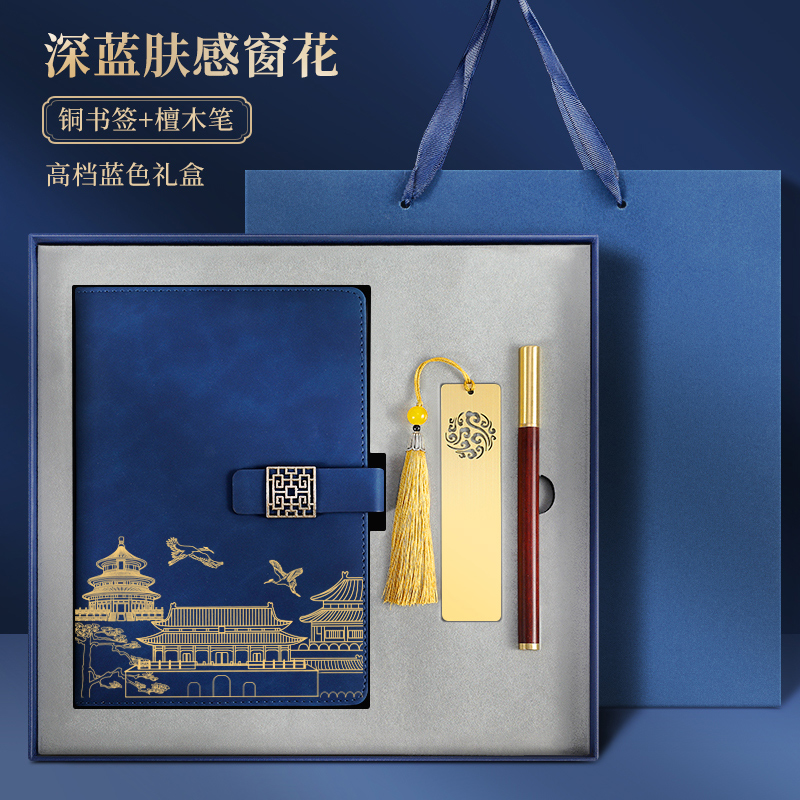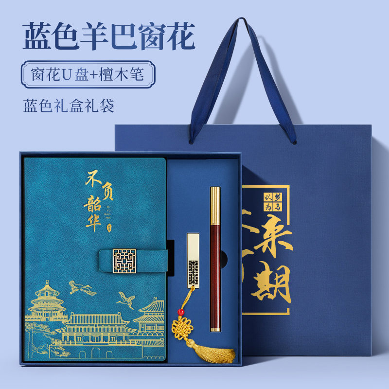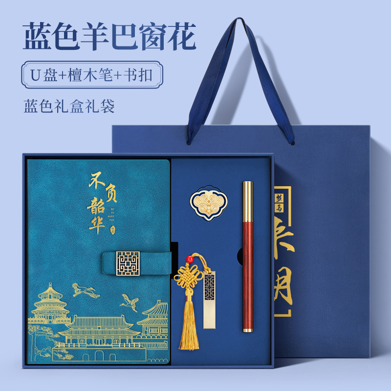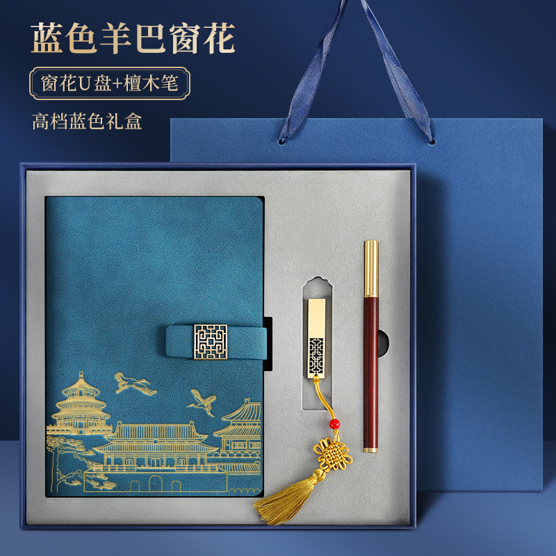 • 자금성 진한 파란색 피부 느낌 창 그릴 + 창 그릴 U 디스크 + 황동 책갈피 + 책 버클 + 백단향 펜 + 고급 파란색 선물 상자