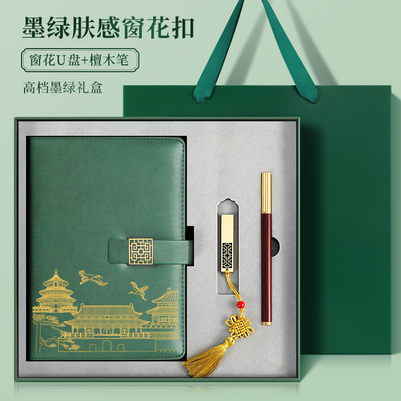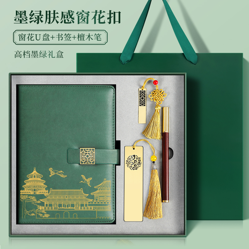 • 자금성 짙은 녹색 피부 느낌 창 그릴 + 창 그릴 U 디스크 + 구리 책갈피 + 백단향 펜 + 고급 짙은 녹색 선물 상자