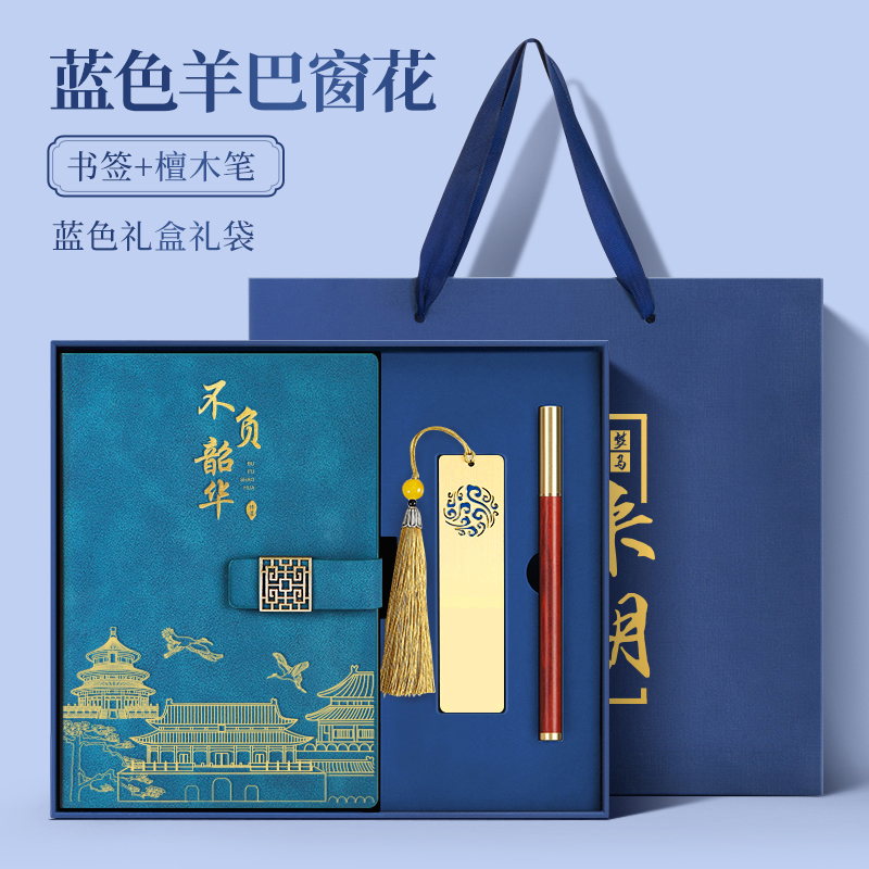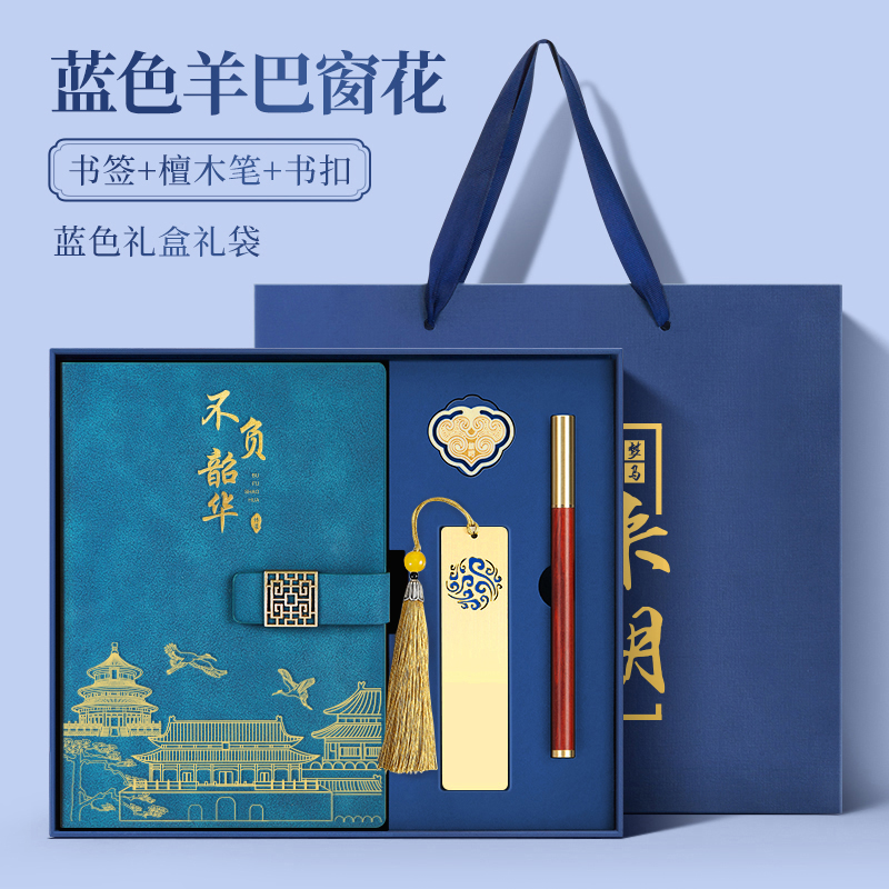 • 자금성 파란색 양 창 그릴 + 창 그릴 U 디스크 + 황동 책갈피 + 책 버클 + 백단향 펜 + 고급 파란색 선물 상자