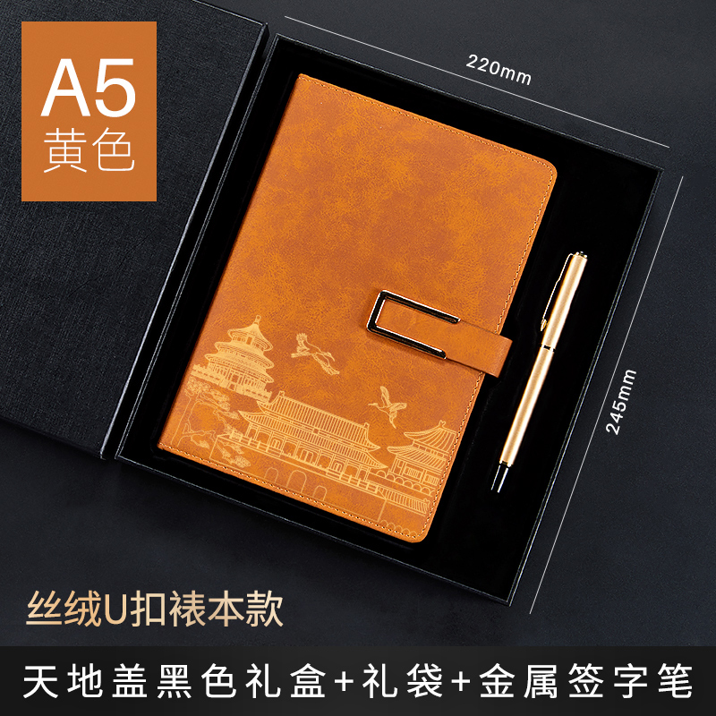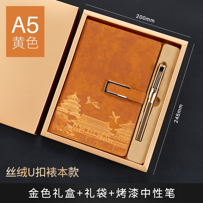 • A5 노란색—벨벳 가죽 P—2507+금속 펜+검은색 선물 상자 선물 가방