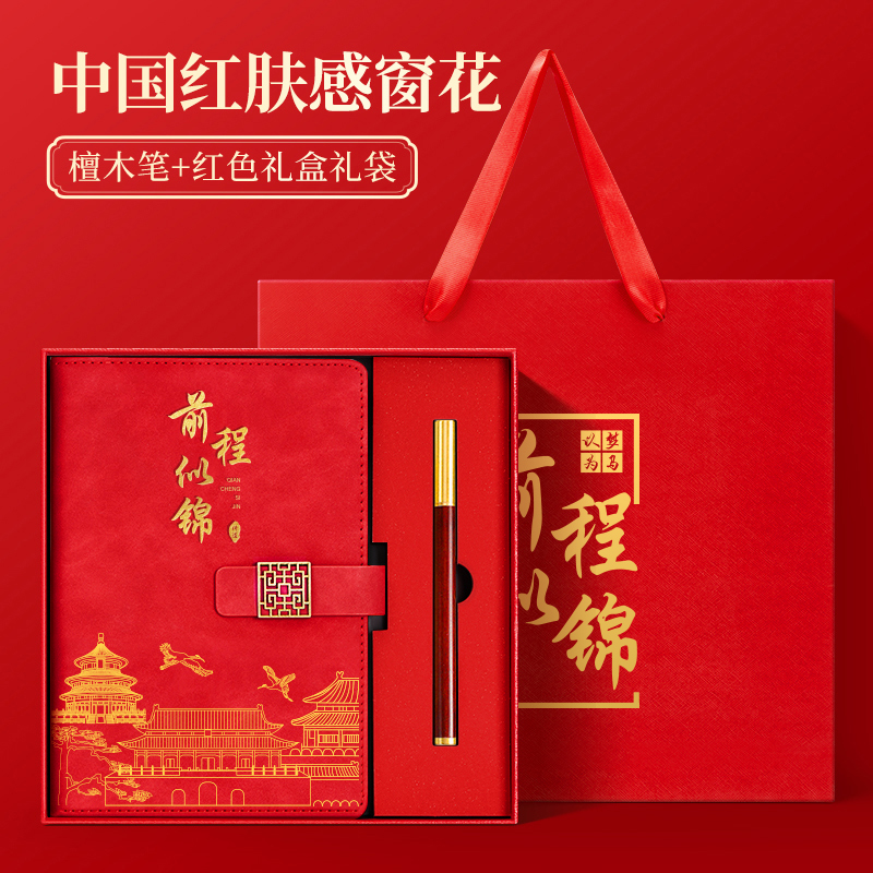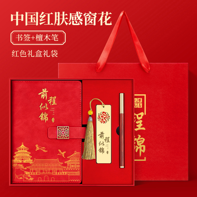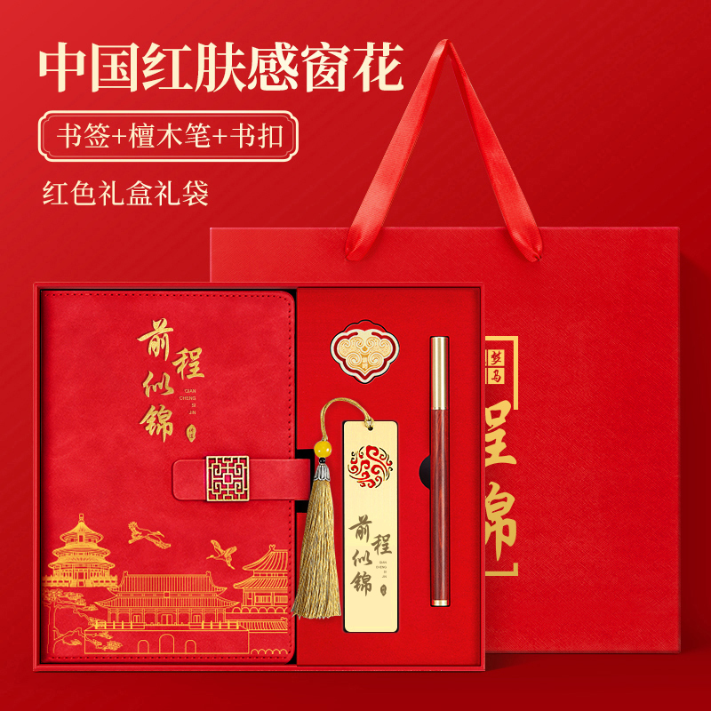 • 밝은 미래 - 중국 붉은 피부 느낌의 창 그릴 + 황동 책갈피 + 책 단추 + 백단향 펜 + 빨간색 상자