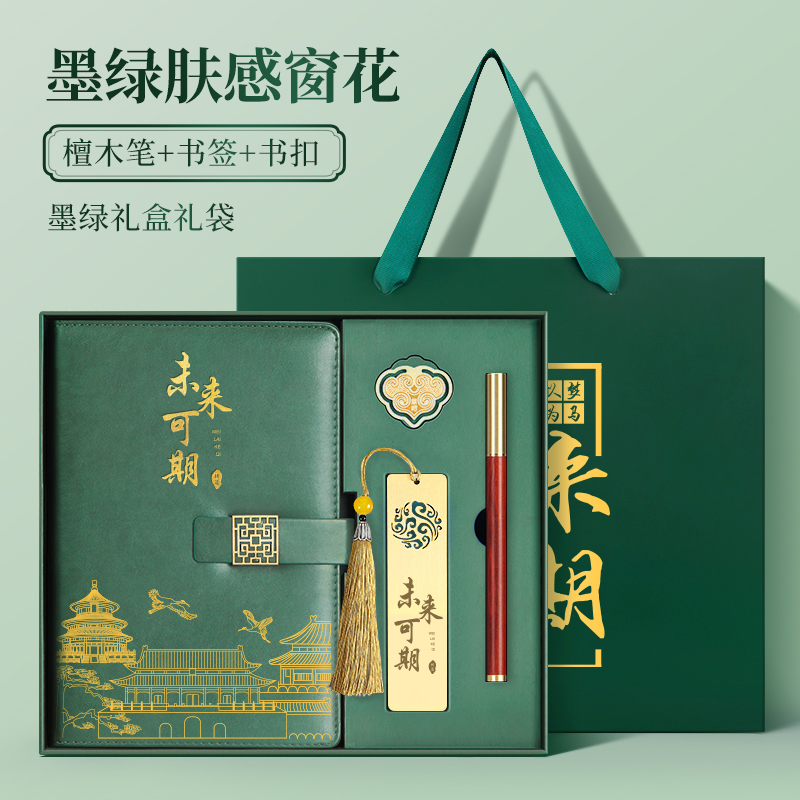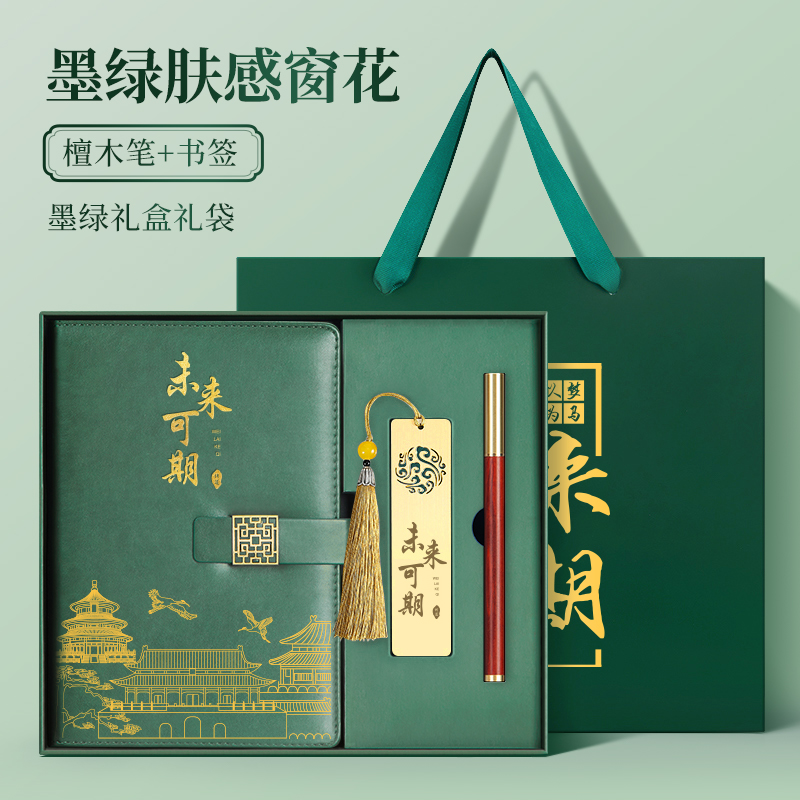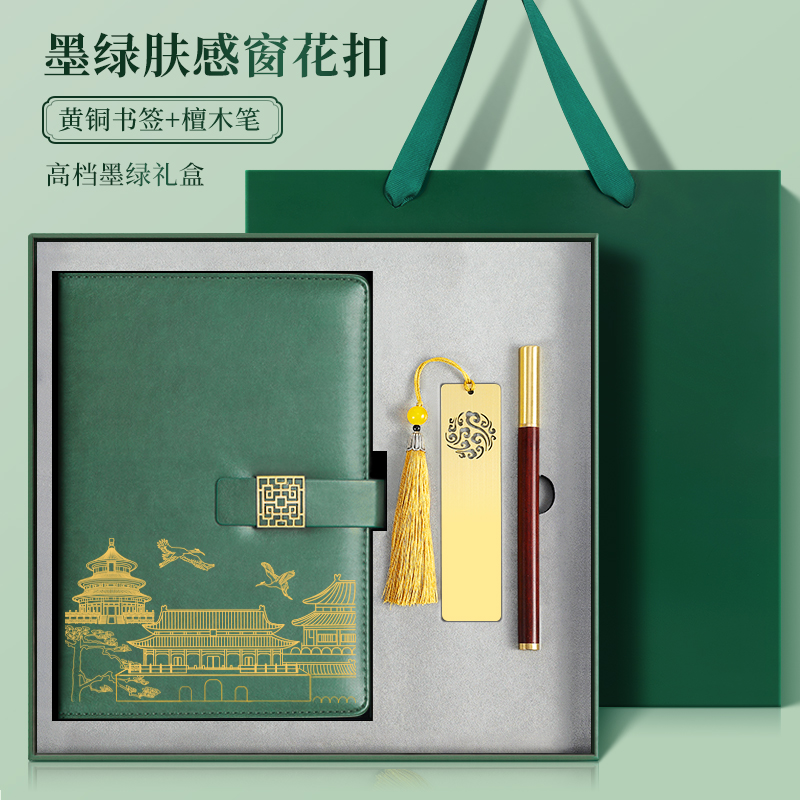 • 자금성 짙은 녹색 피부 느낌 창 그릴 + 구리 책갈피 + 백단향 펜 + 고급 짙은 녹색 선물 상자