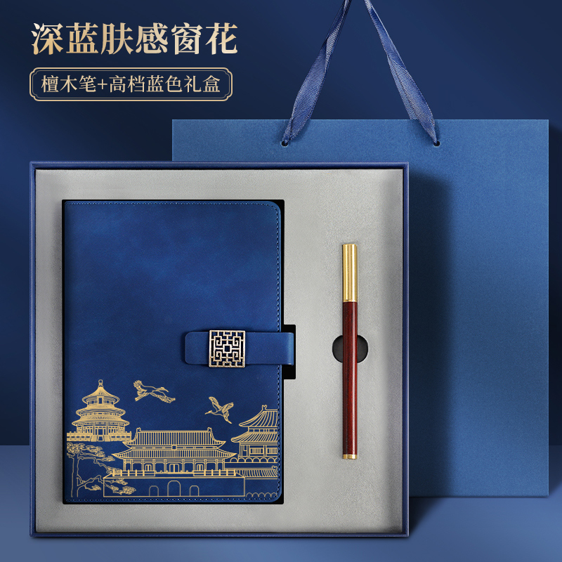 • 진한 파란색 피부 느낌의 창 그릴 + 창 그릴 U 디스크 + 백단향 펜 + 고급 파란색 선물 상자