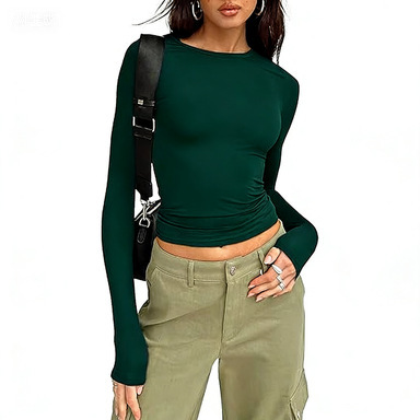 유럽과 미국 여성 캐주얼 반팔 티셔츠 봄과 가을 단색 슬림 핏 풀오버 티셔츠 여성용 스트리트 베이스 셔츠 탑