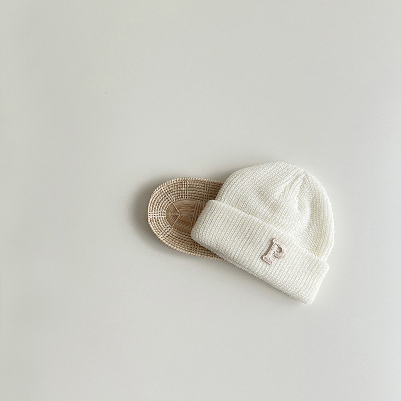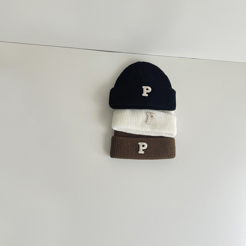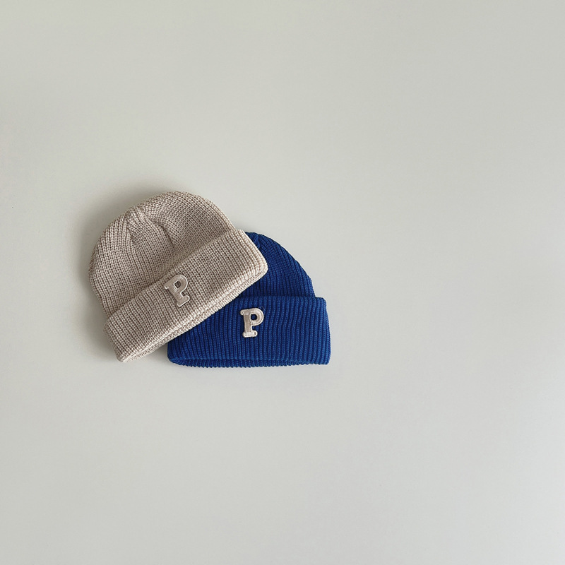 한국 가을과 겨울 어린이 모자 따뜻한 2023 어린이 니트 캡 P 편지 베이비 풀오버 캡 베이비 울 캡 조수