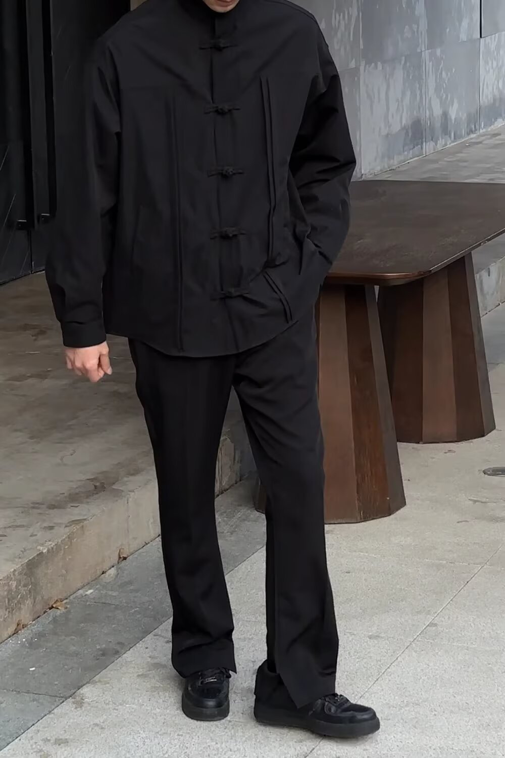 가을 독특한 새로운 중국 스타일 국가 스타일 탕 세트 셔츠 남자의 이른 가을 캐주얼 고급 버튼 긴 소매 탑 블랙