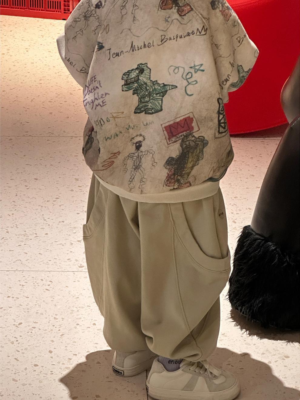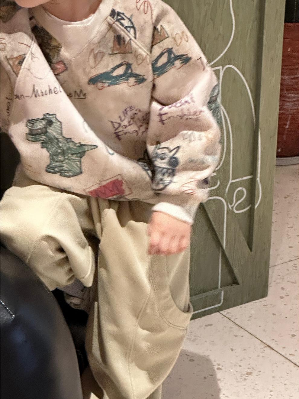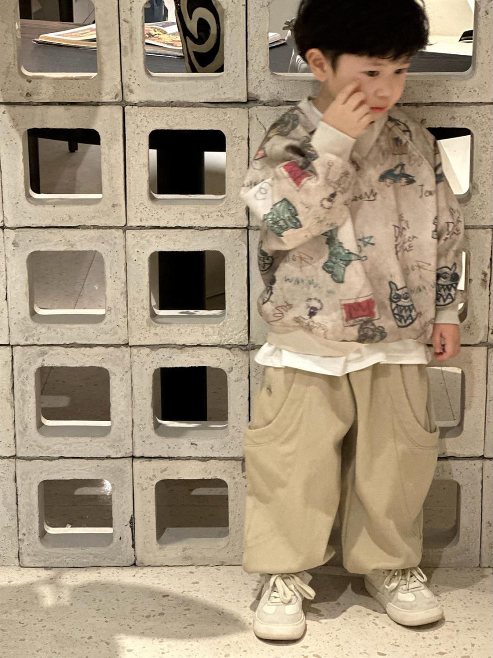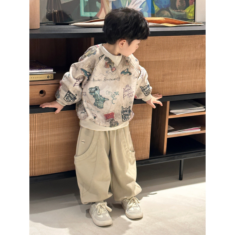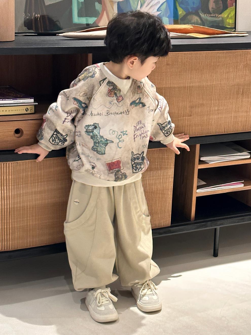 한국 아동복 2024 가을 새로운 디지털 공룡 타이 염료 풀오버 조끼 어린이 살구색 바지 투피스 세트스토어 가기
