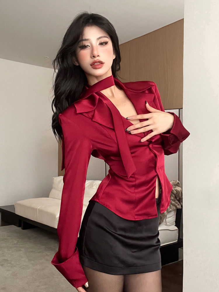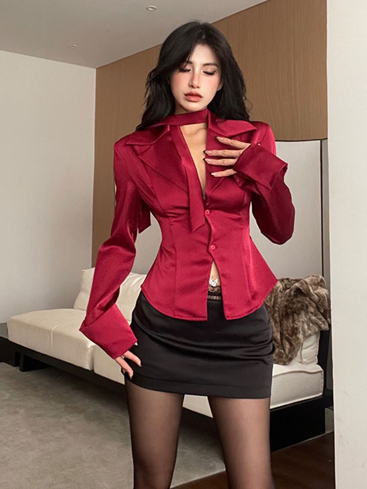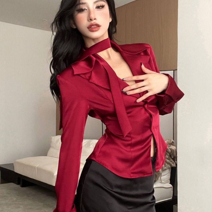 새틴 셔츠 여자의 2024 봄 새로운 스타일 숙녀 우아한 리본 원피스 칼라 셔츠 프랑스 세련된 짧은 탑