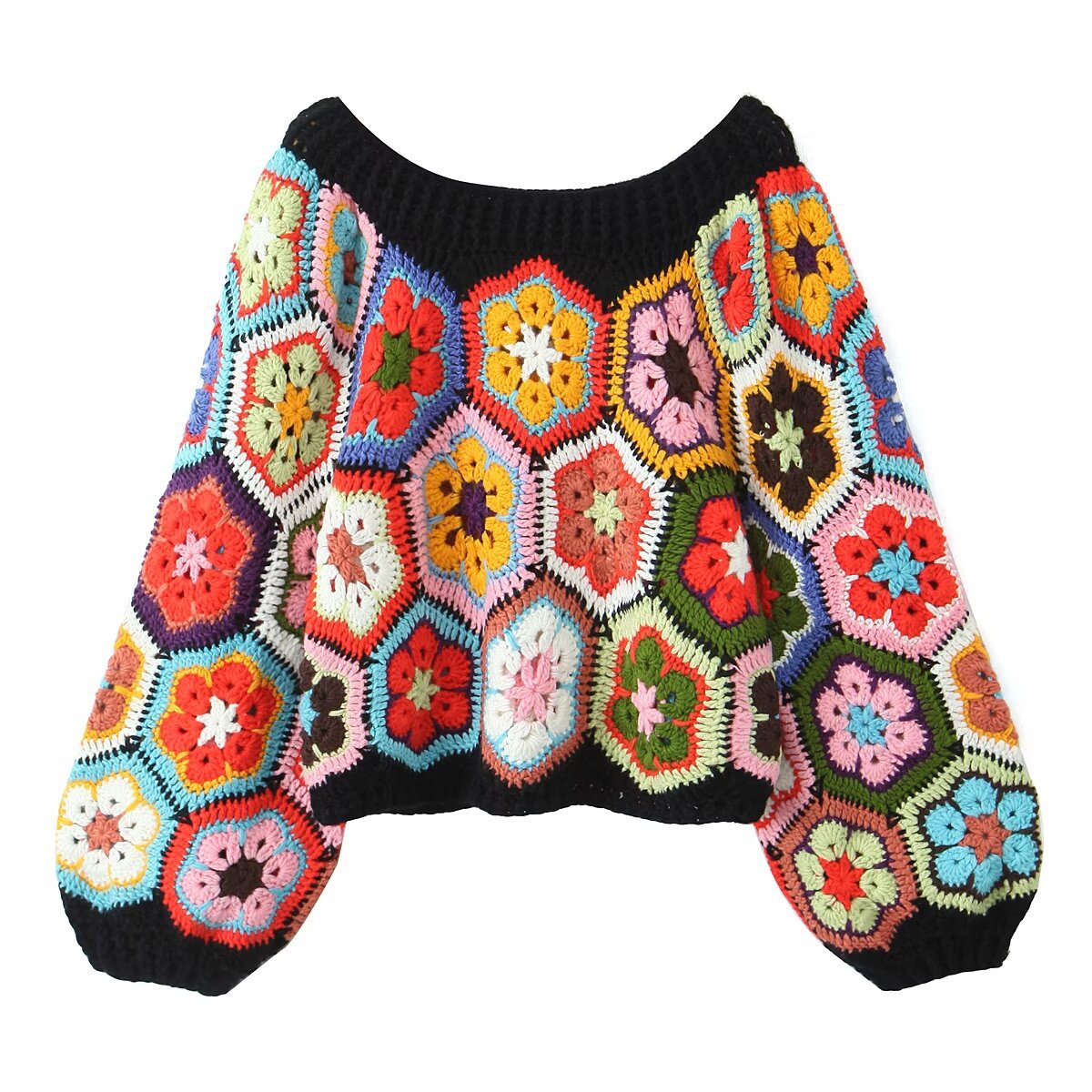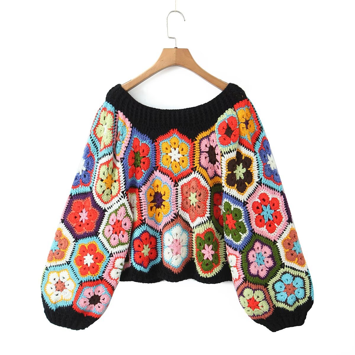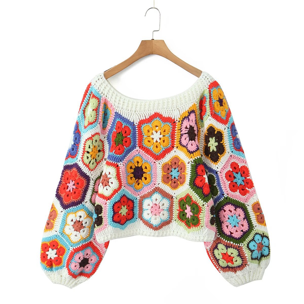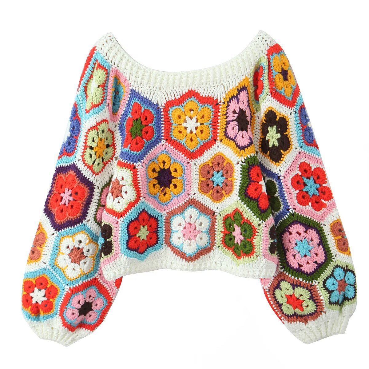 수제 크로 셰 뜨개질 스웨터 여자의 2024 가을 새로운 유럽과 미국의 뜨거운 소녀 느슨한 크루 넥 짧은 블라우스 스웨터
