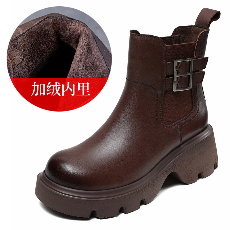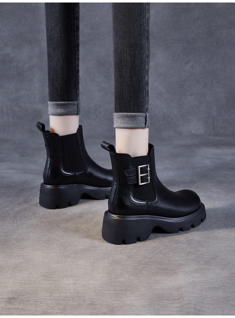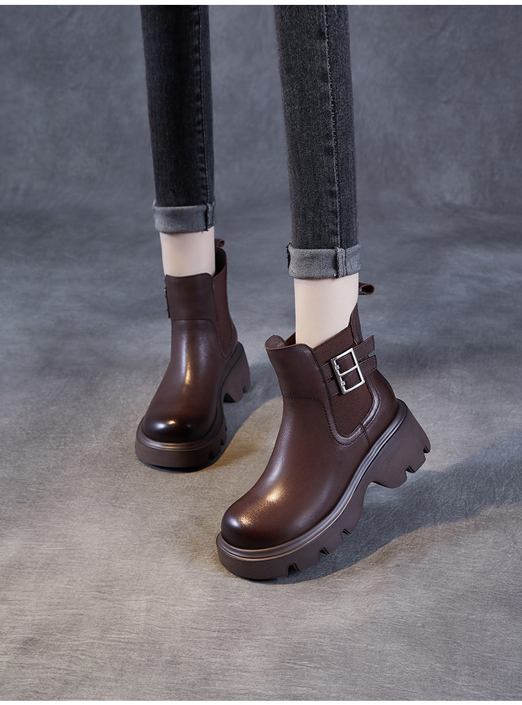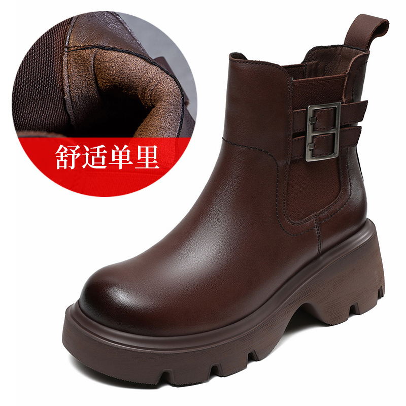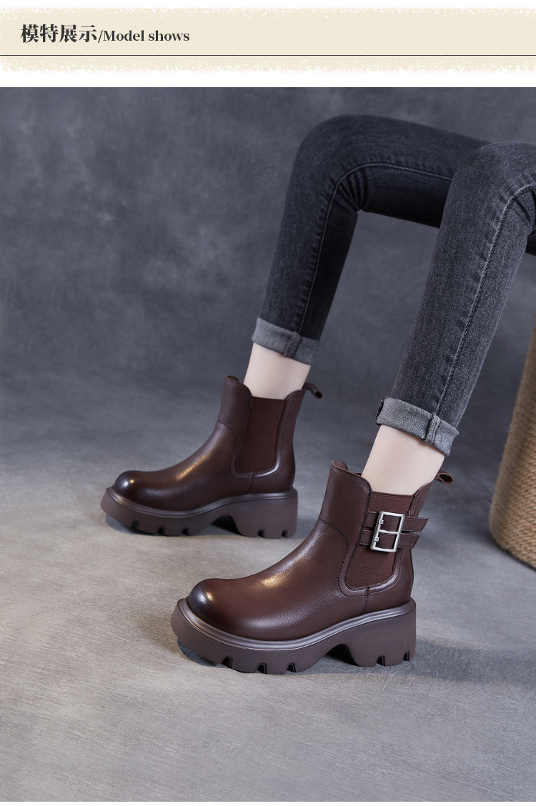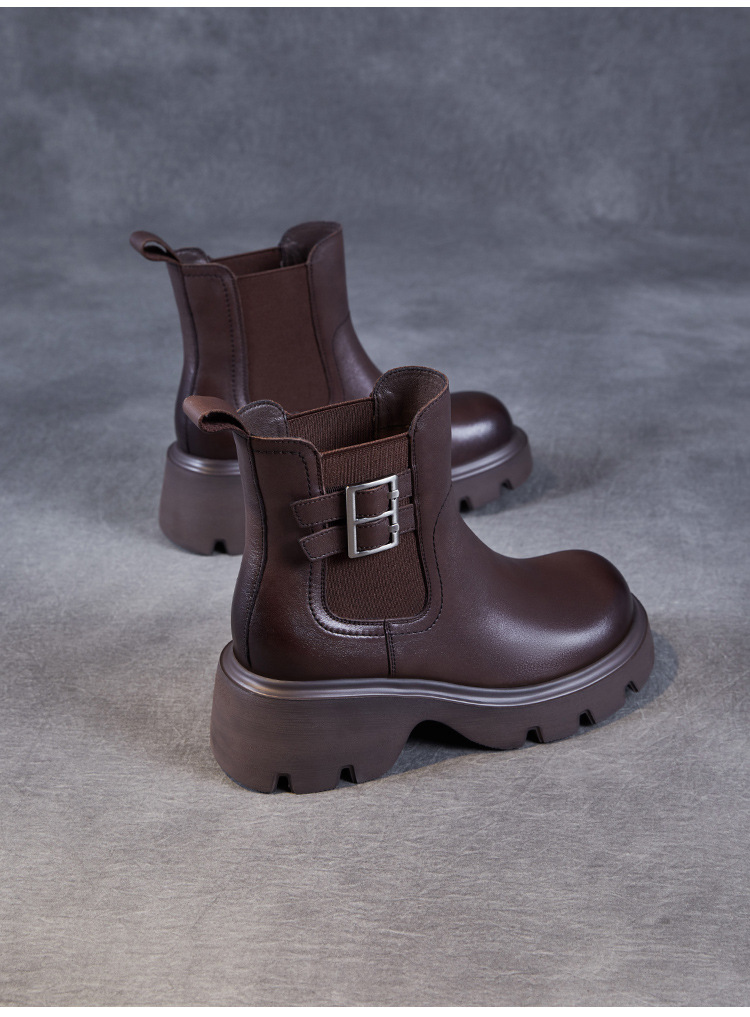 가을과 겨울 2024 빈티지 정품 가죽 영국 첼시 부츠 여자 두꺼운 밑창 쁘띠 다크 브라운 벨트 버클 두꺼운 힐 발목 부츠스토어 가기
