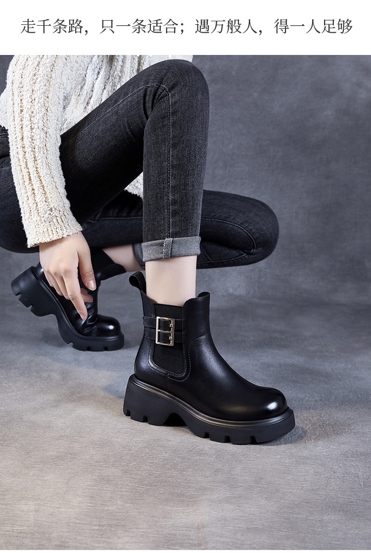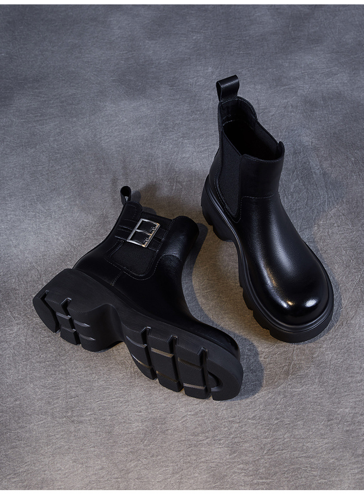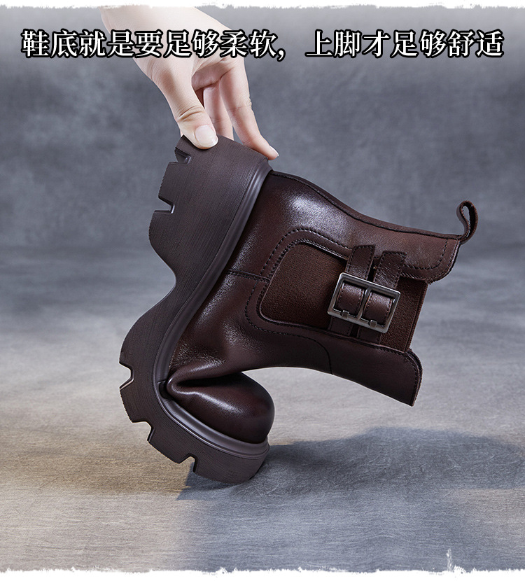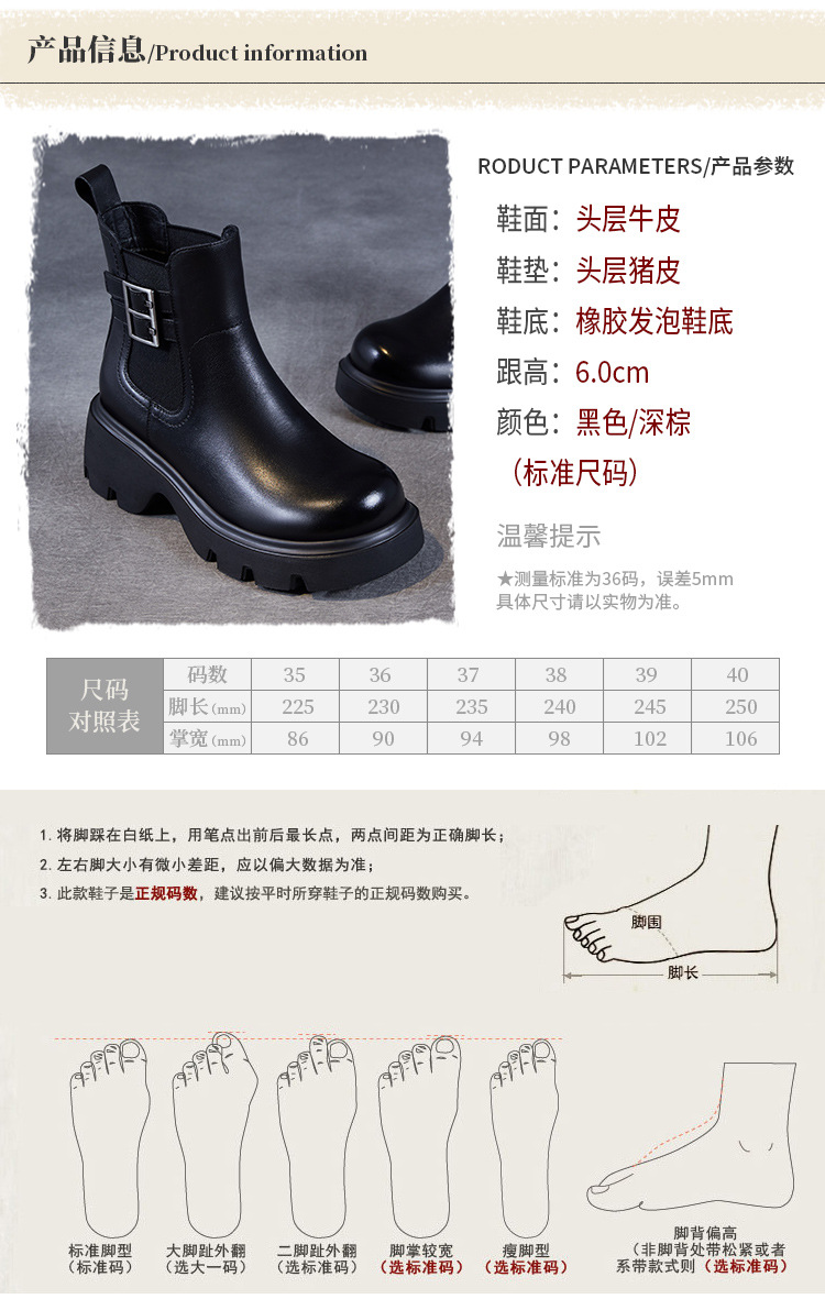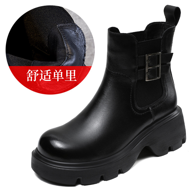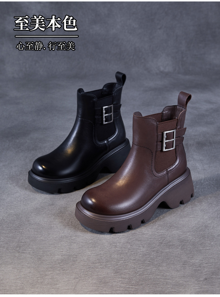 가을과 겨울 2024 빈티지 정품 가죽 영국 첼시 부츠 여자 두꺼운 밑창 쁘띠 다크 브라운 벨트 버클 두꺼운 힐 발목 부츠스토어 가기