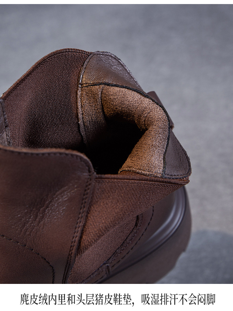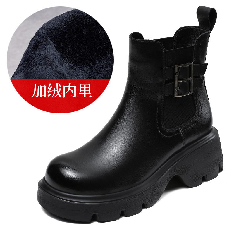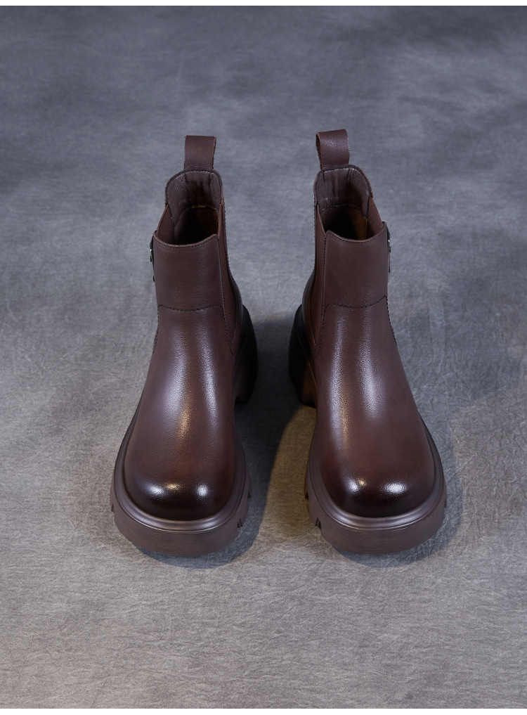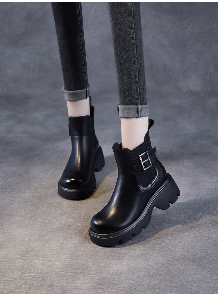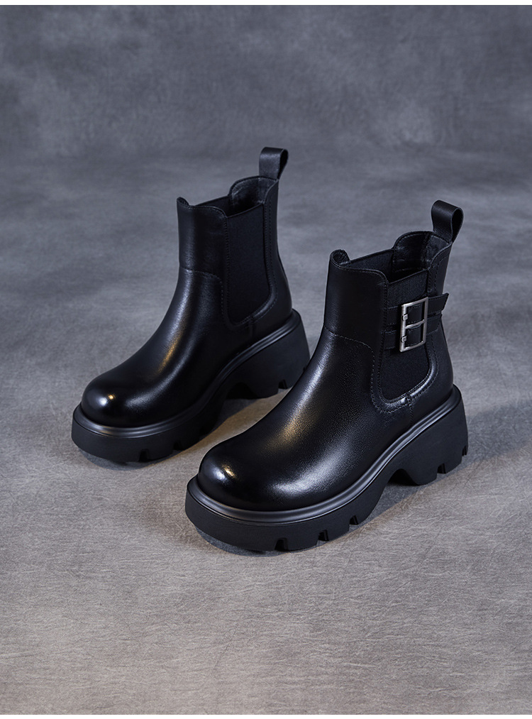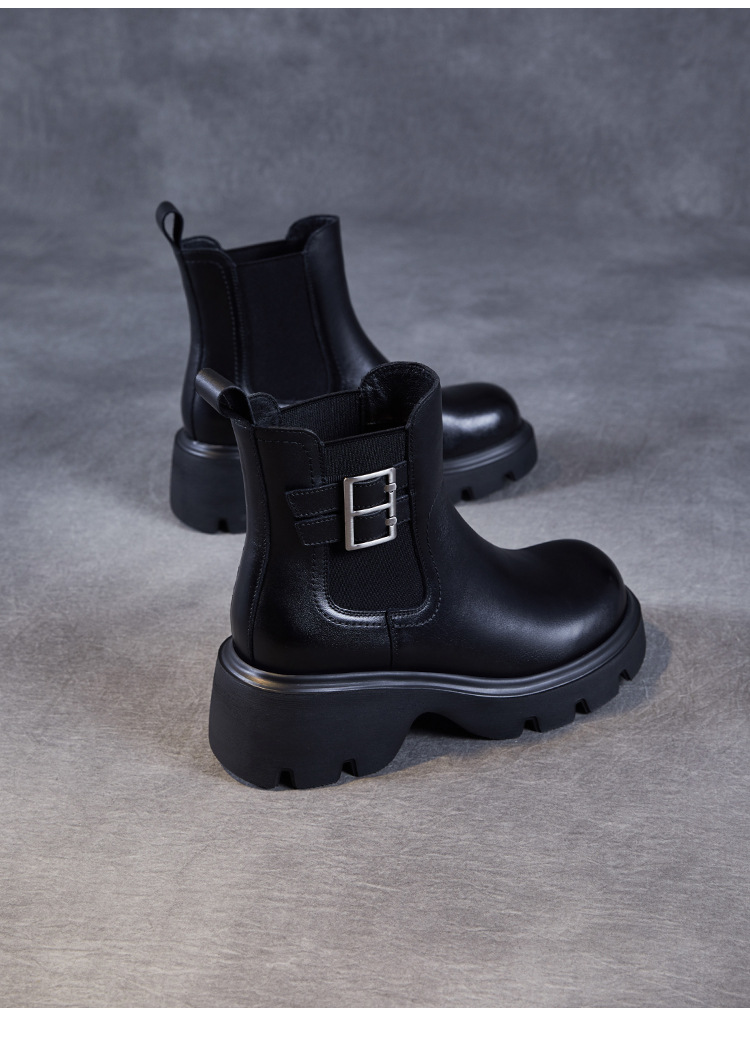 가을과 겨울 2024 빈티지 정품 가죽 영국 첼시 부츠 여자 두꺼운 밑창 쁘띠 다크 브라운 벨트 버클 두꺼운 힐 발목 부츠스토어 가기