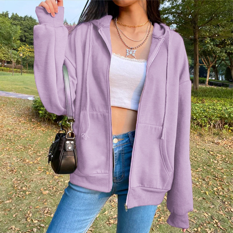 20224 단색 후드 플리스 스웨트셔츠 여성용 스트리트 루즈핏 지퍼 탑스토어 가기