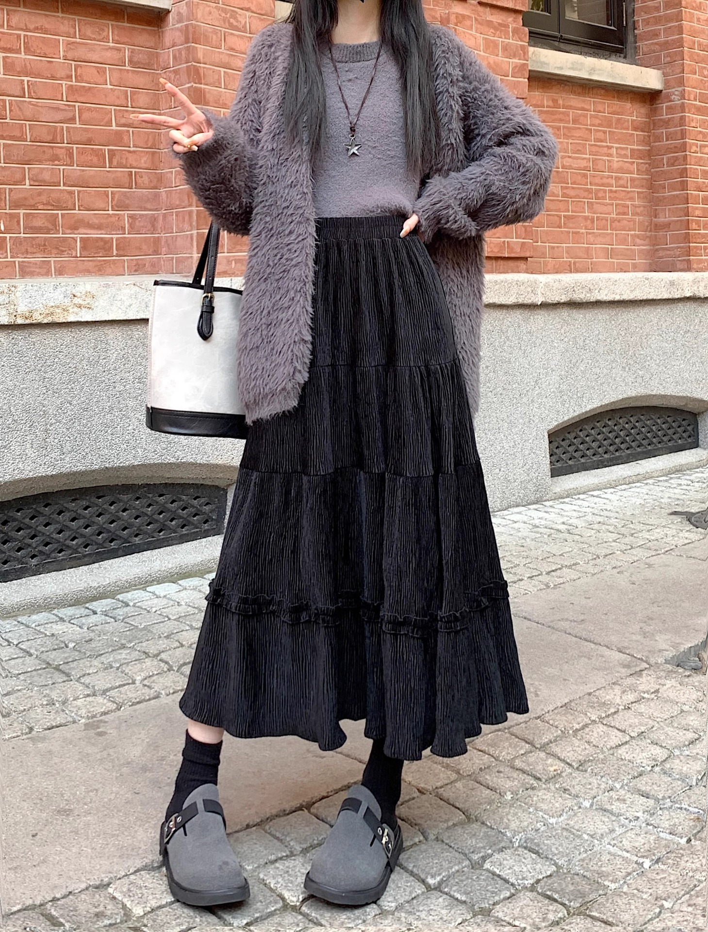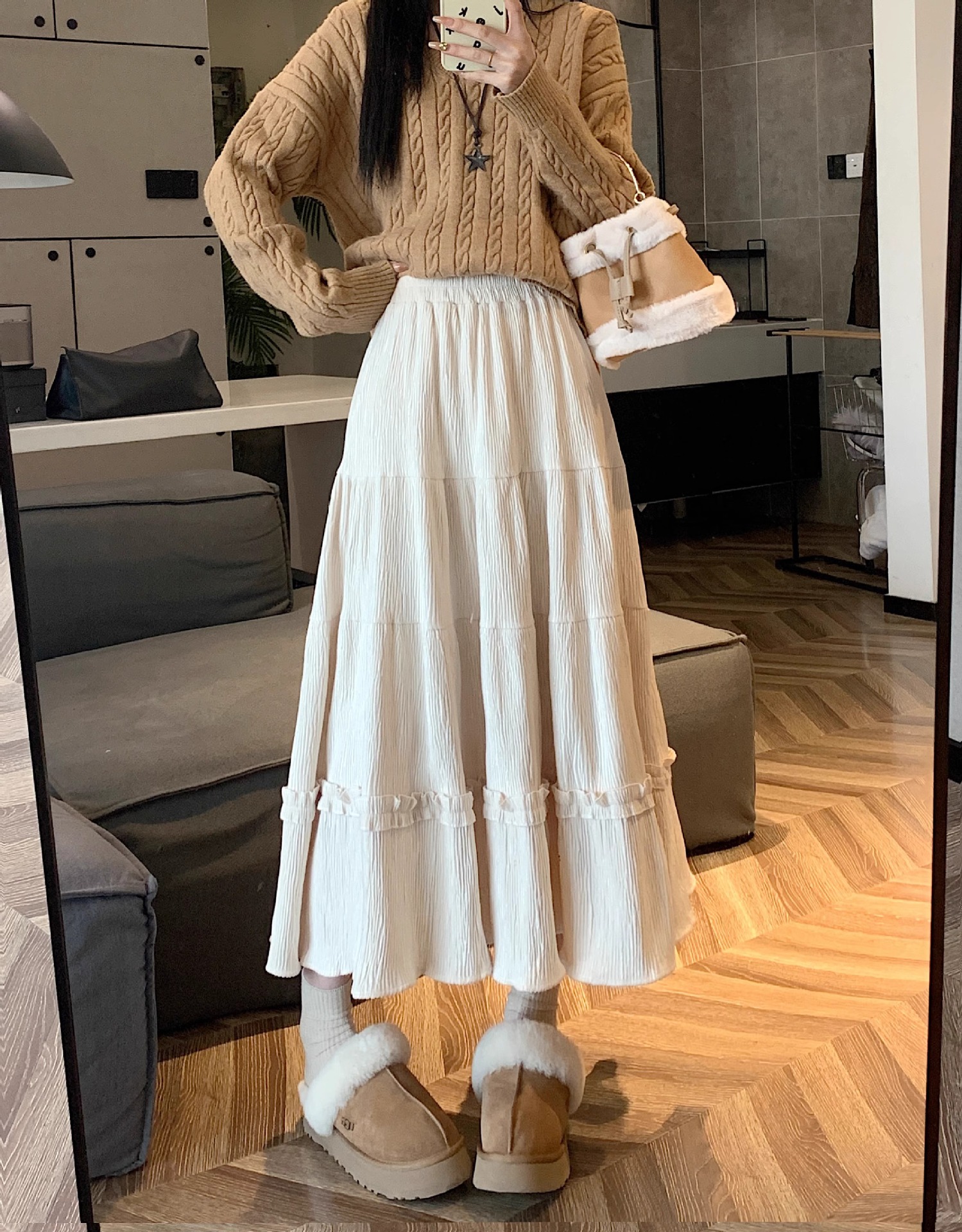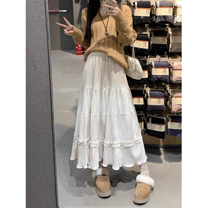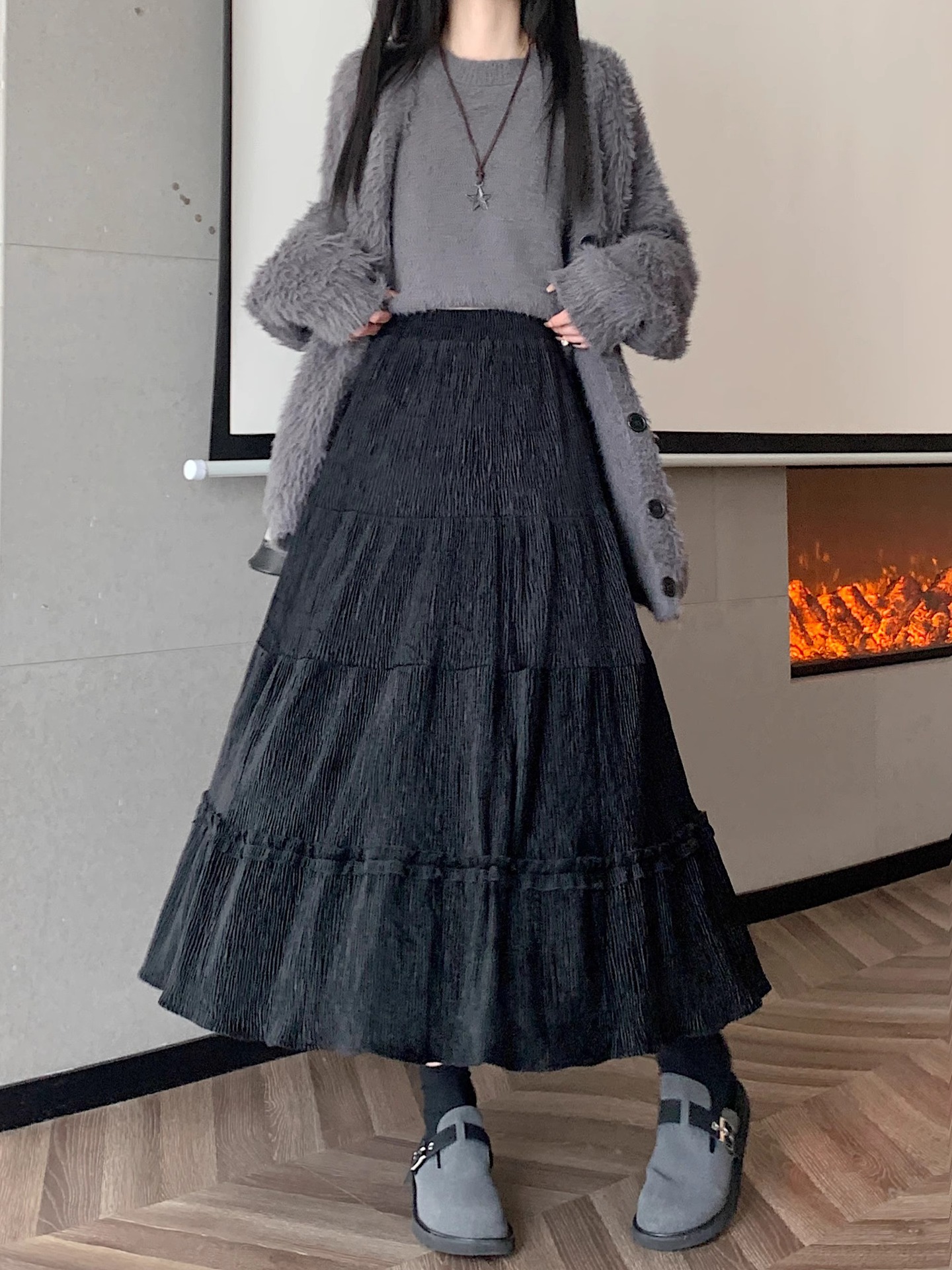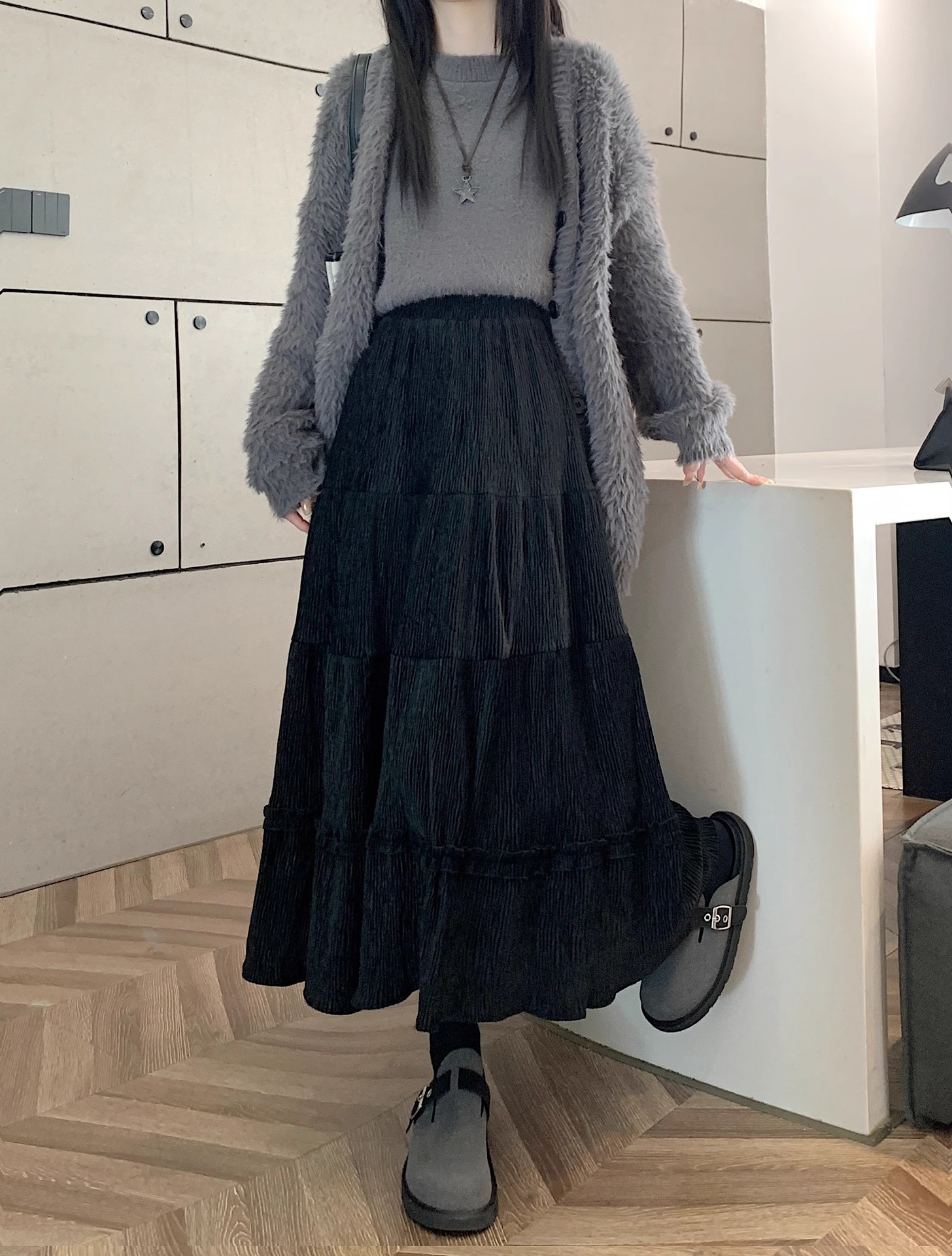 부드러운 귀 가장자리 질감 느슨한 올 매치 스커트 여성의 가을 및 겨울 높은 허리 드레이프 주름 큰 우산 스커트