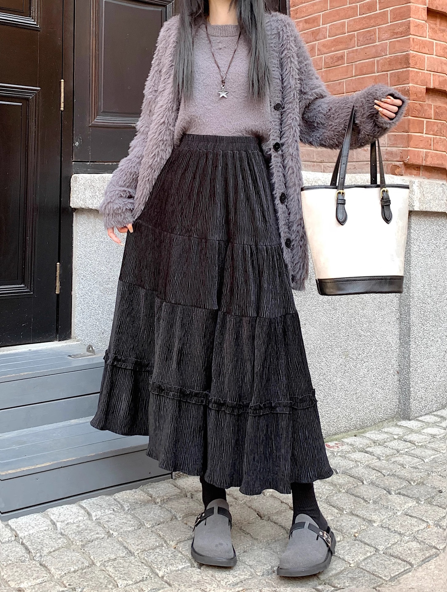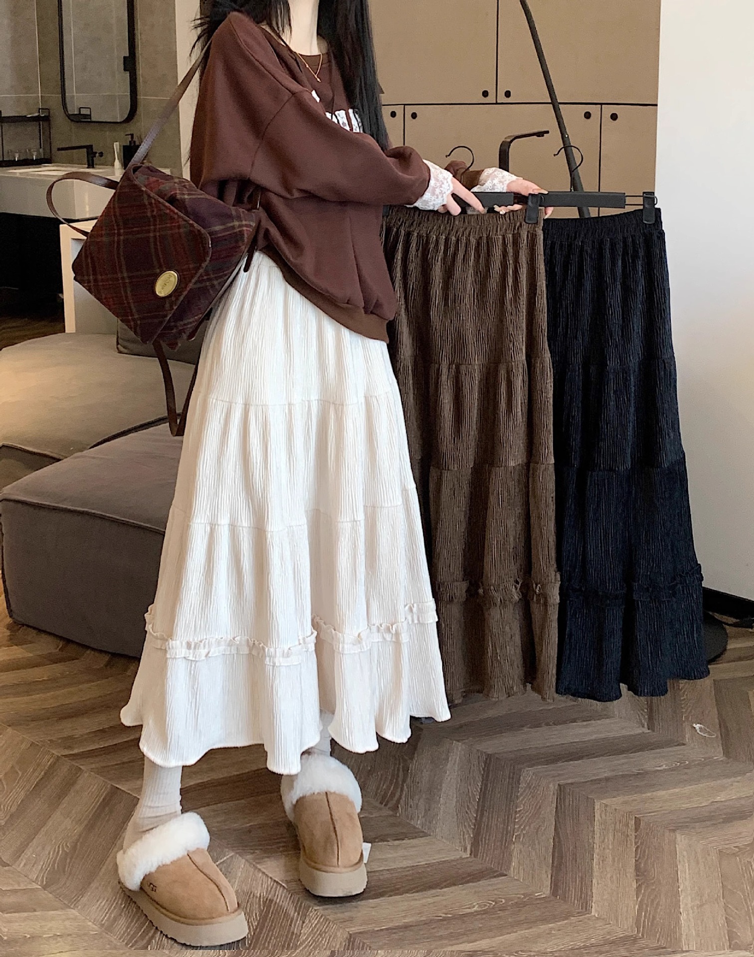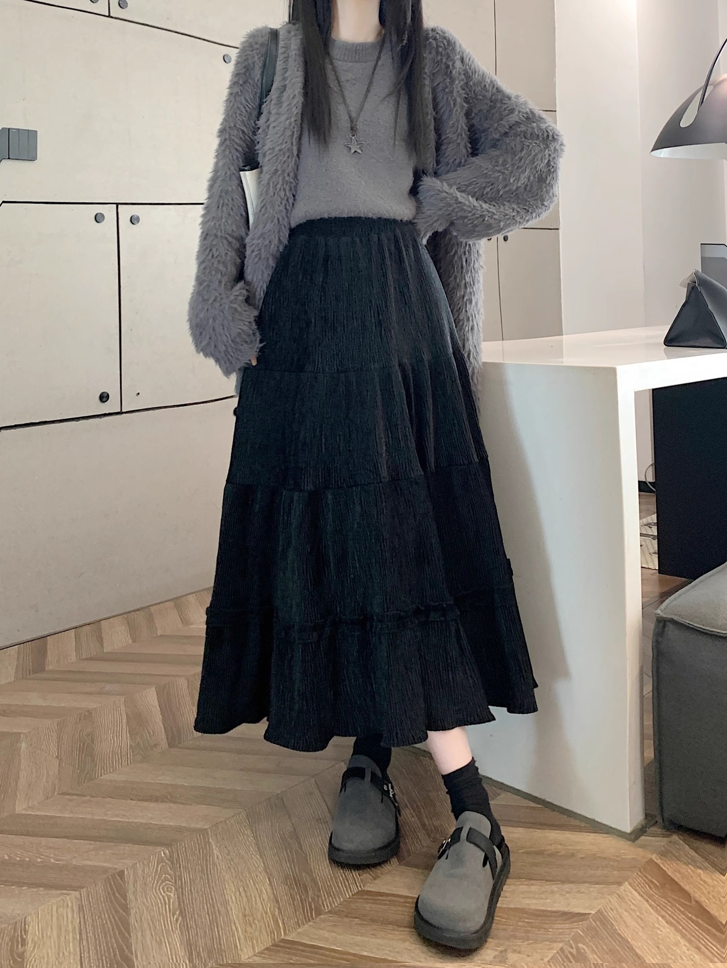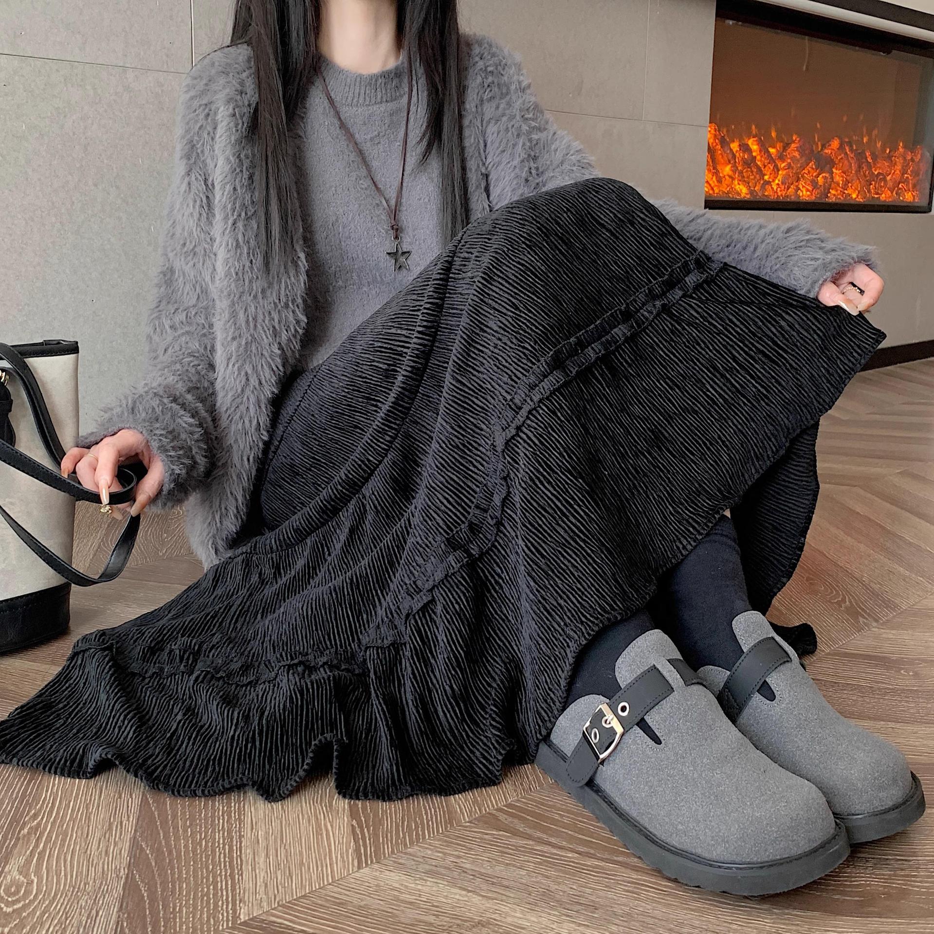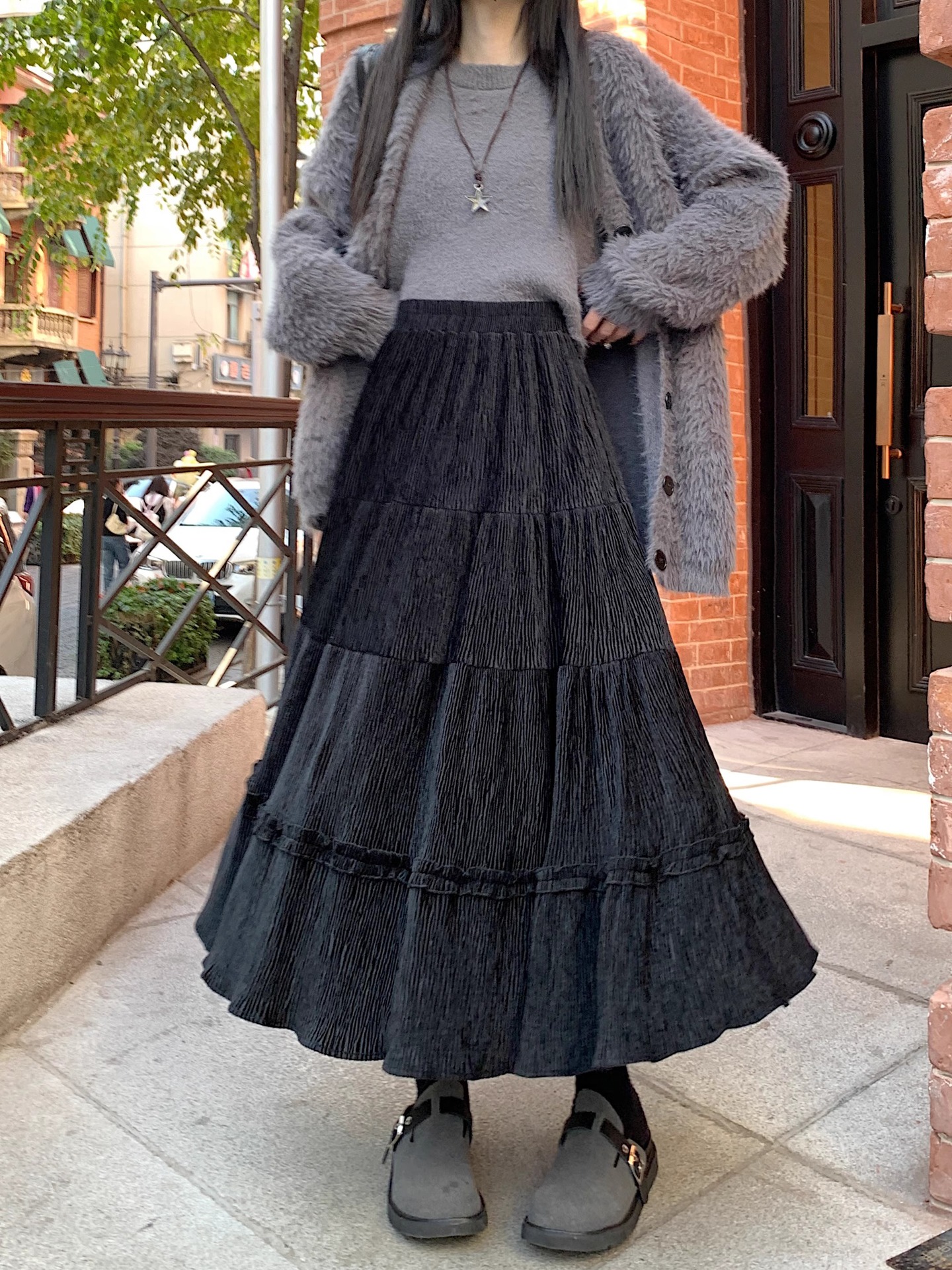 부드러운 귀 가장자리 질감 느슨한 올 매치 스커트 여성의 가을 및 겨울 높은 허리 드레이프 주름 큰 우산 스커트스토어 가기