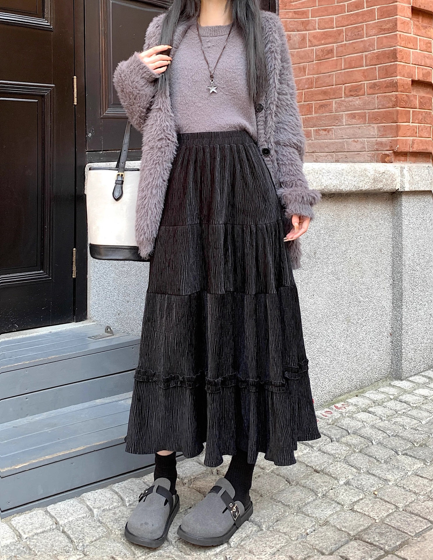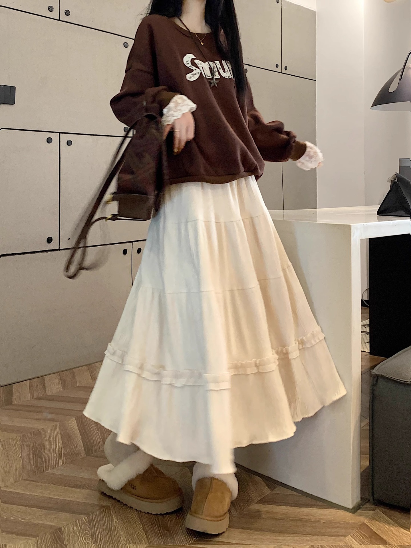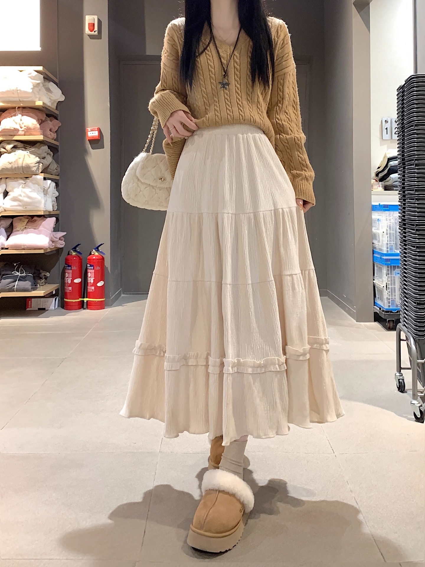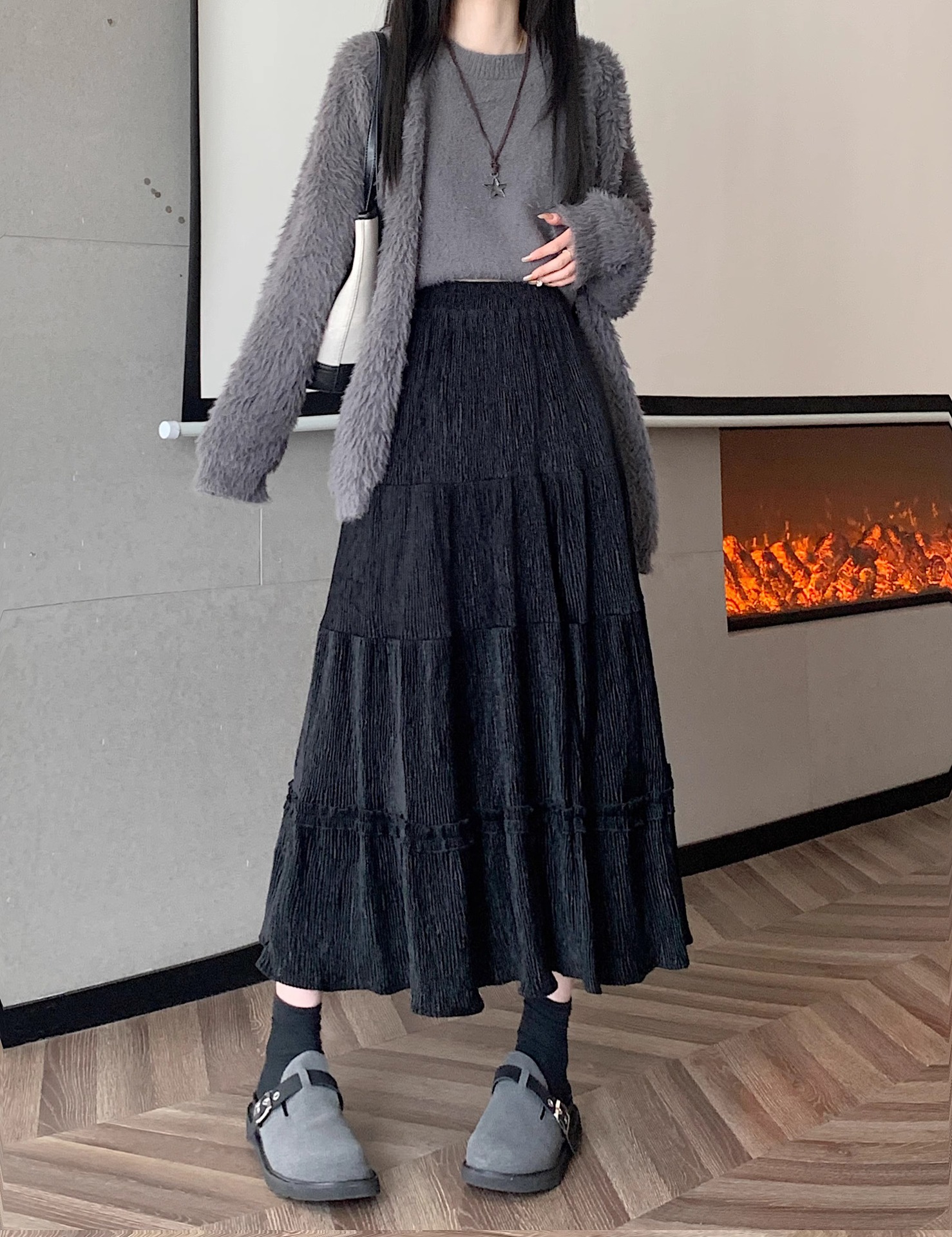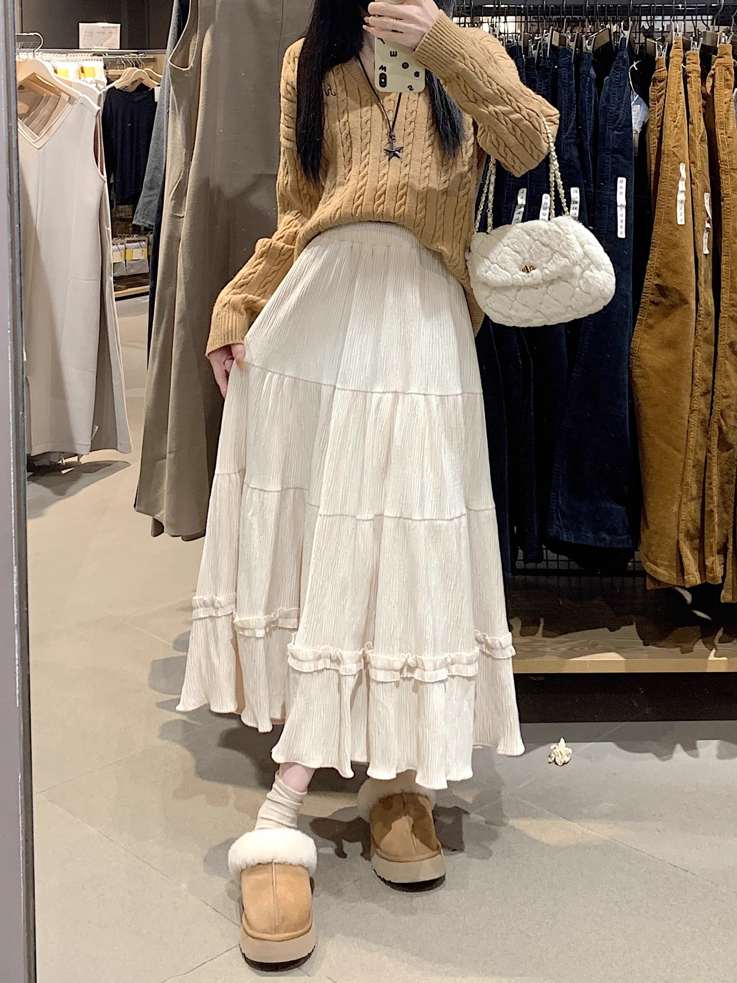 부드러운 귀 가장자리 질감 느슨한 올 매치 스커트 여성의 가을 및 겨울 높은 허리 드레이프 주름 큰 우산 스커트스토어 가기