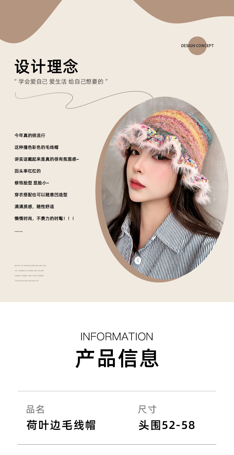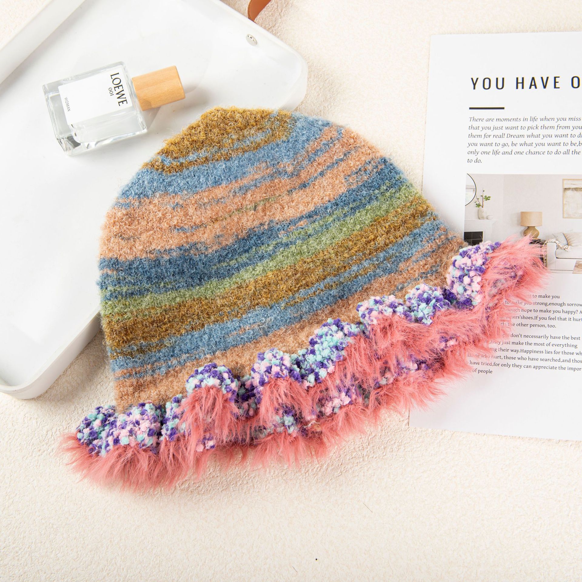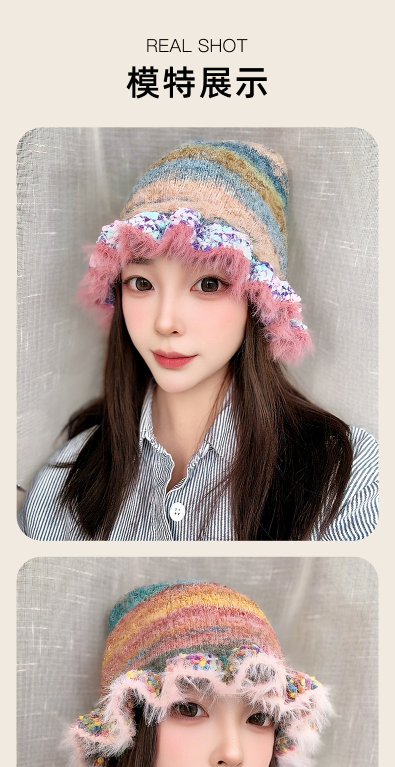 빈티지 유화 러플 니트 모자 여성의 가을과 겨울 따뜻한 달콤한 귀여운 줄무늬 컬러 울 모자스토어 가기