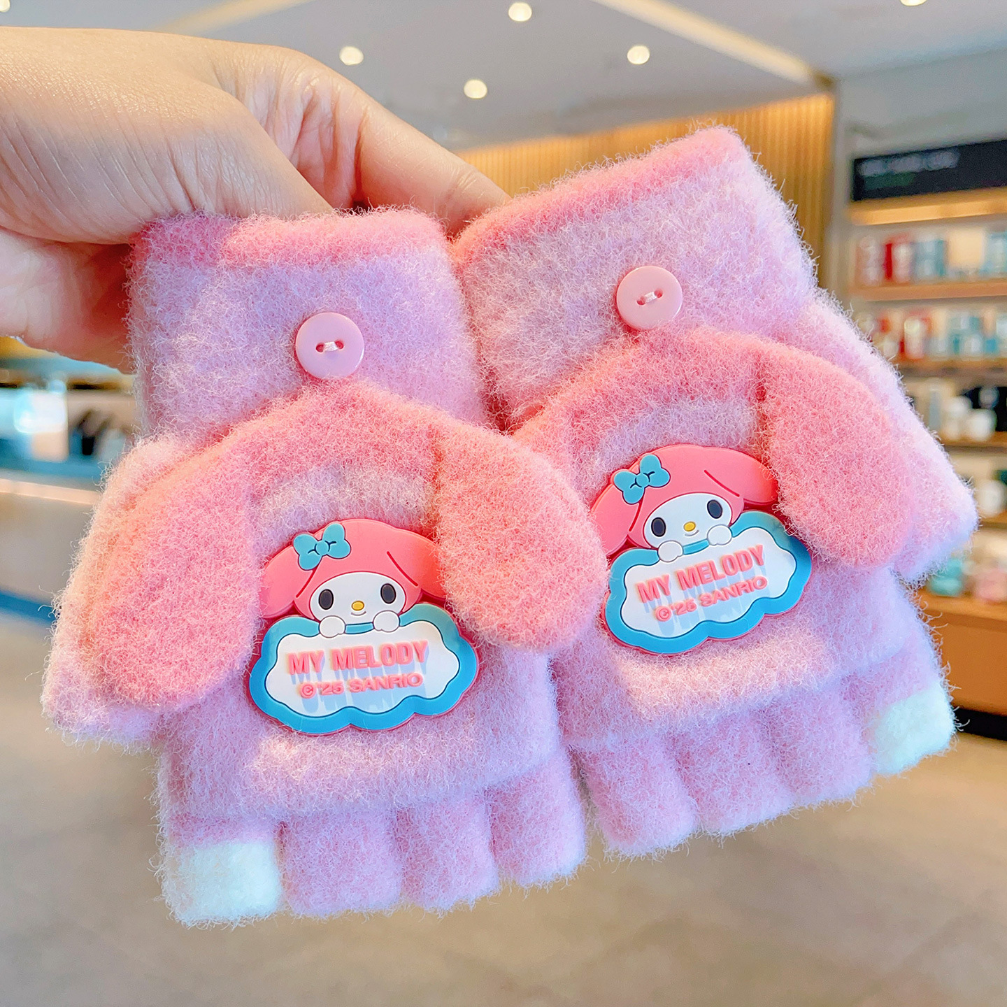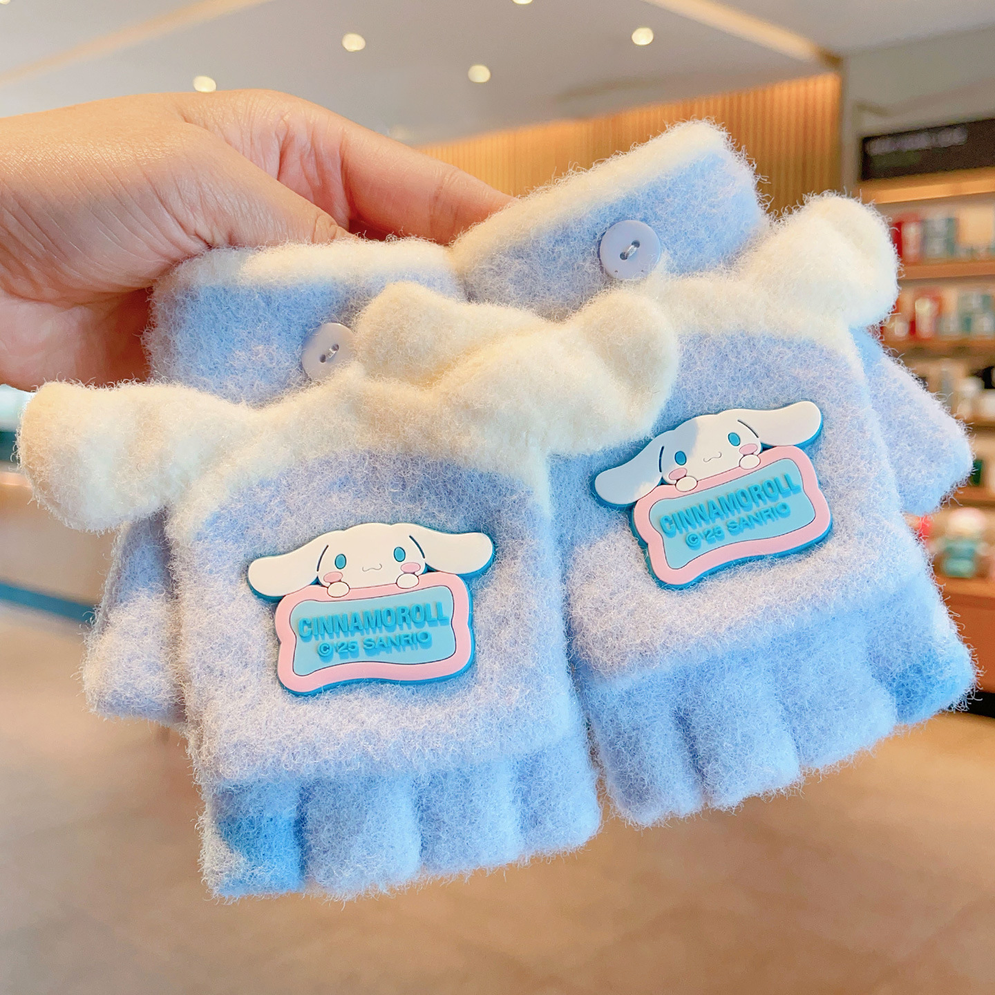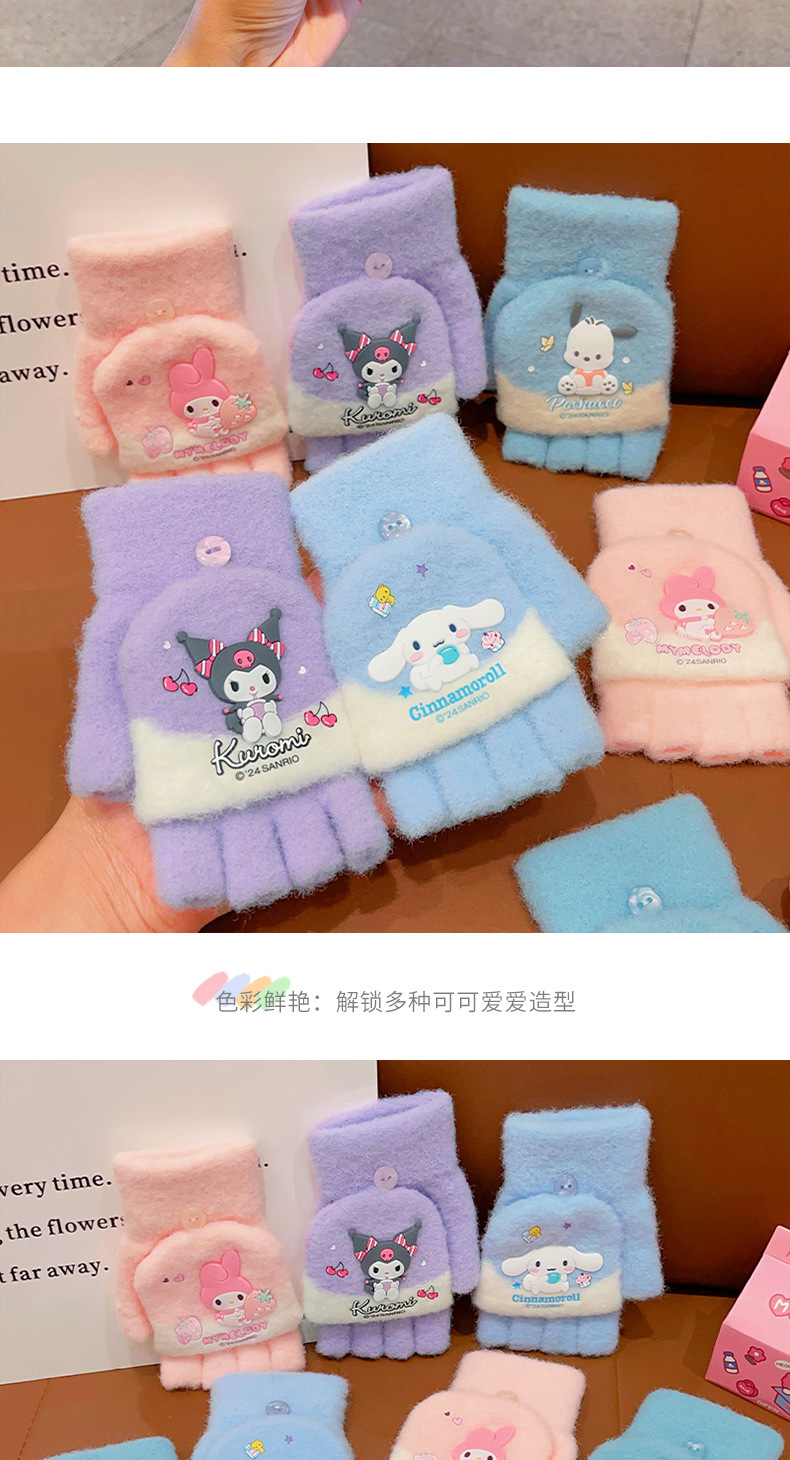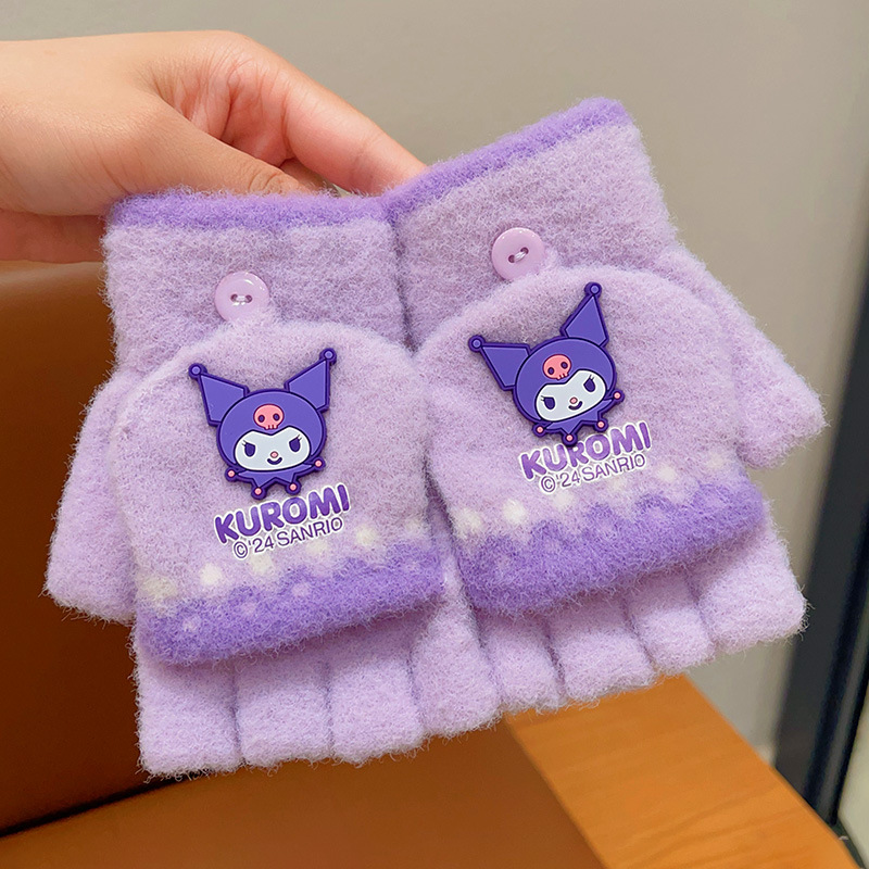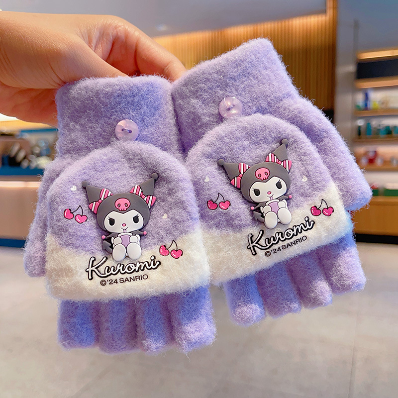 쿠로미 어린이용 장갑, 남아 및 여아용 귀여운 만화 벨벳 플립 탑 다섯 손가락 장갑, 여아용 필기 및 보온용 장갑스토어 가기