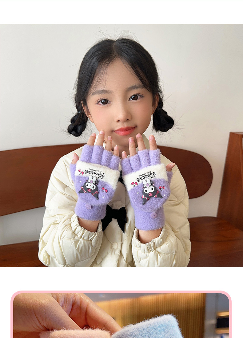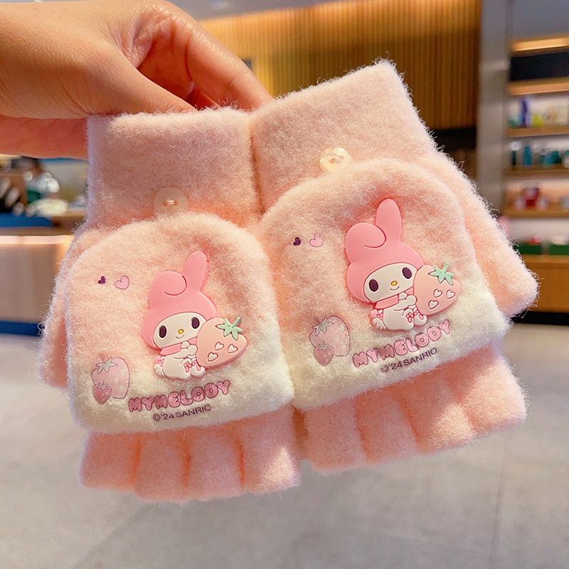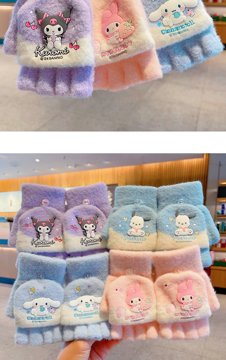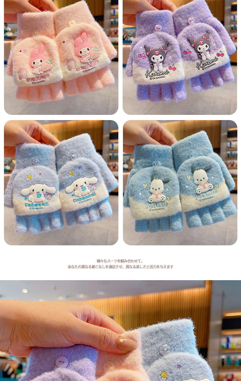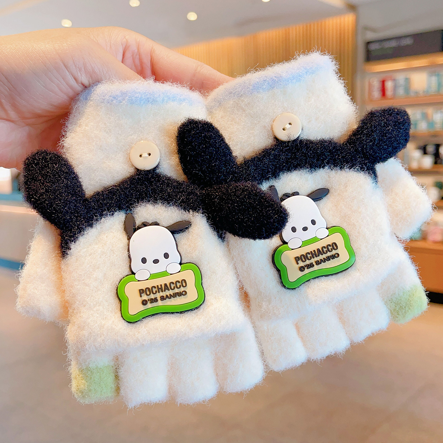 쿠로미 어린이용 장갑, 남아 및 여아용 귀여운 만화 벨벳 플립 탑 다섯 손가락 장갑, 여아용 필기 및 보온용 장갑스토어 가기