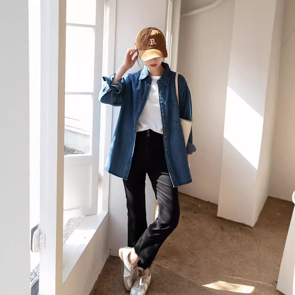 2025 가을 신상 데님 셔츠 여성용 한국 스타일 중간 길이 재킷 레트로 긴팔 레이어드 셔츠 재킷 상의