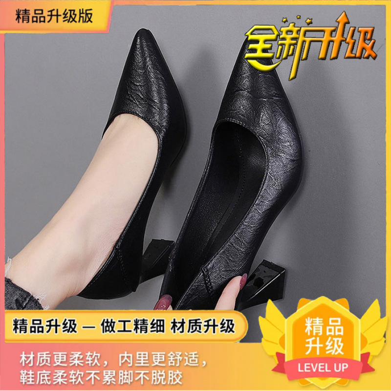 브랜드 깨진 크기 정품 가죽 뾰족한 발가락 싱글 레이어 신발 여성 두꺼운 힐 블랙 작업 신발 슈퍼 소프트 올 매치 패션 신발 양밍