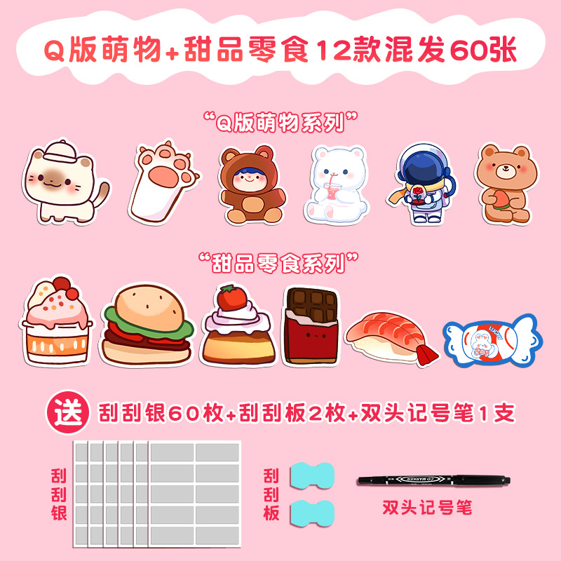 • 큐티한 동물 캐릭터 + 달콤한 디저트 & 간식 - 12종 혼합 60매 [스크래치 코팅 필름 + 스크래치 스크래퍼 + 마커펜]✓
