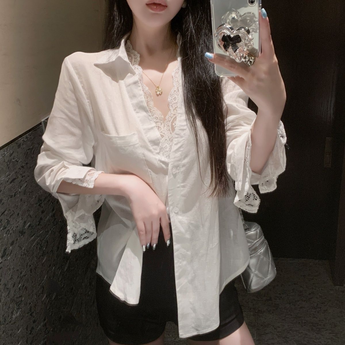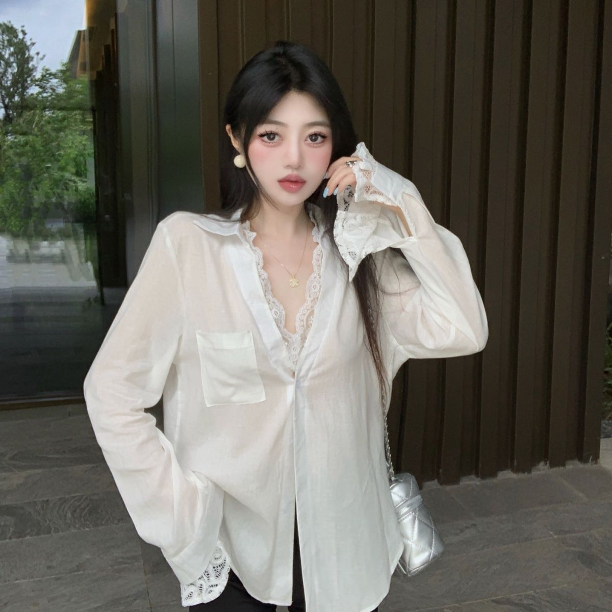 2024 심플 스타일 고급 화이트 페이크 투피스 레이스 스티칭 세트 긴팔 느슨한 셔츠 최고 여성의 가을