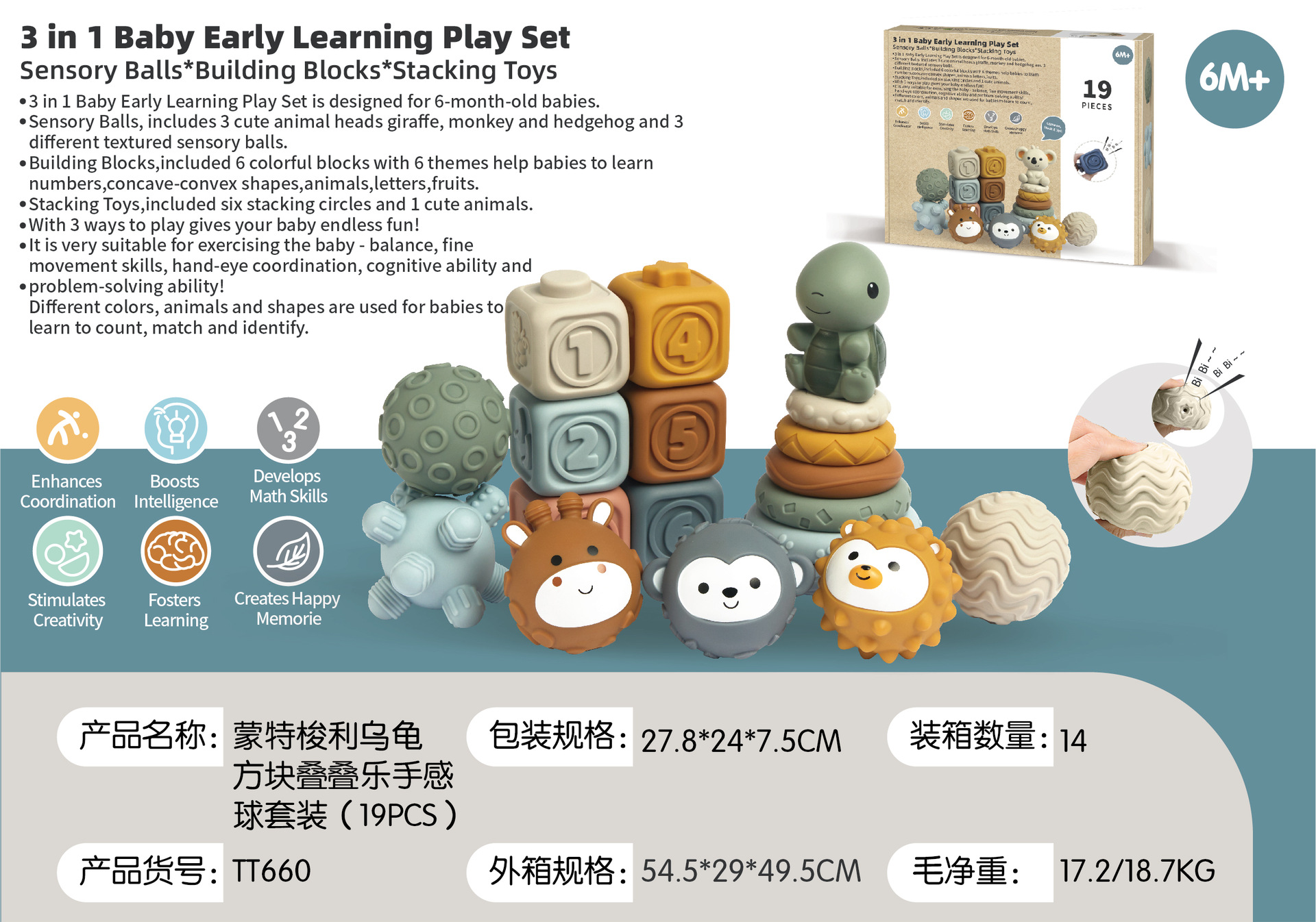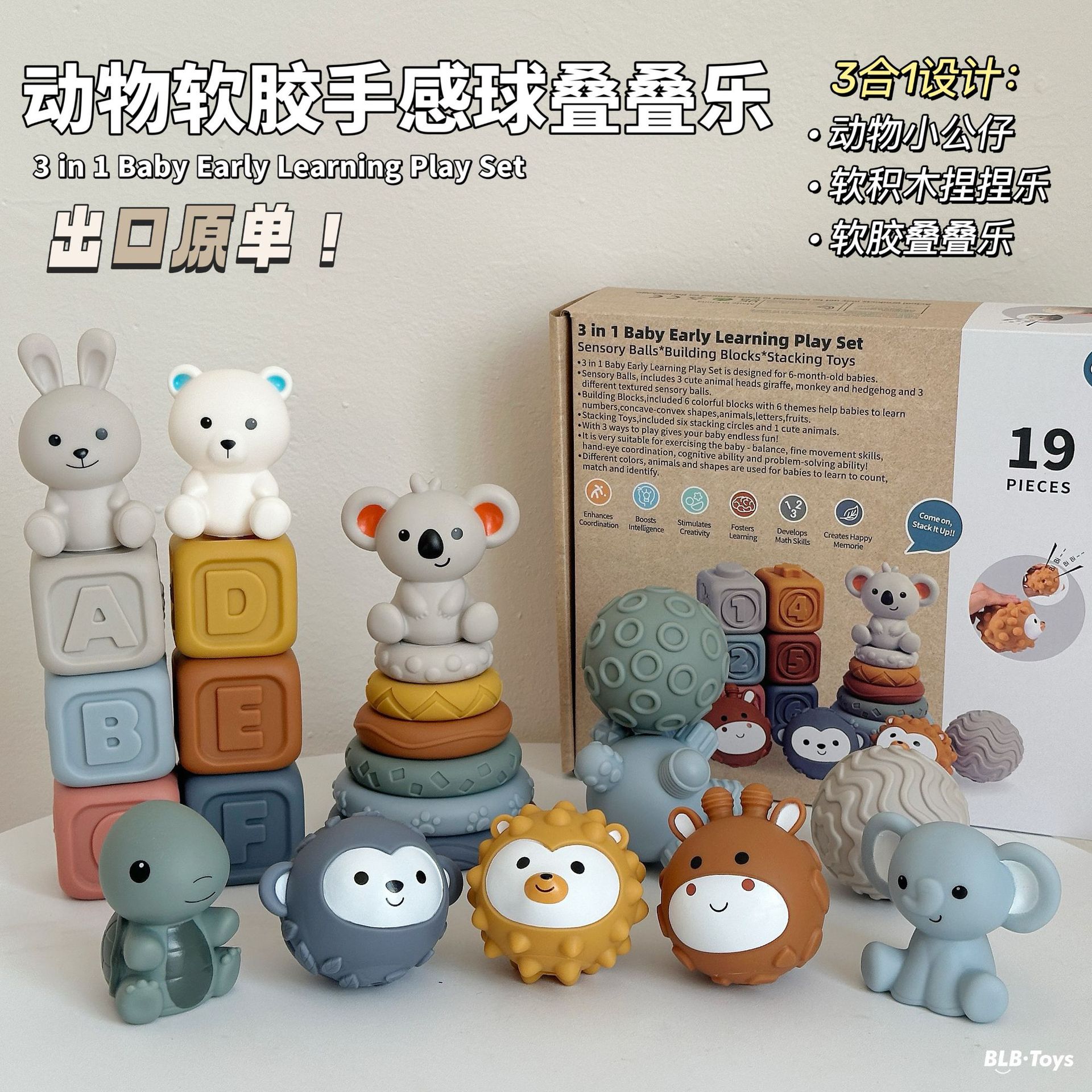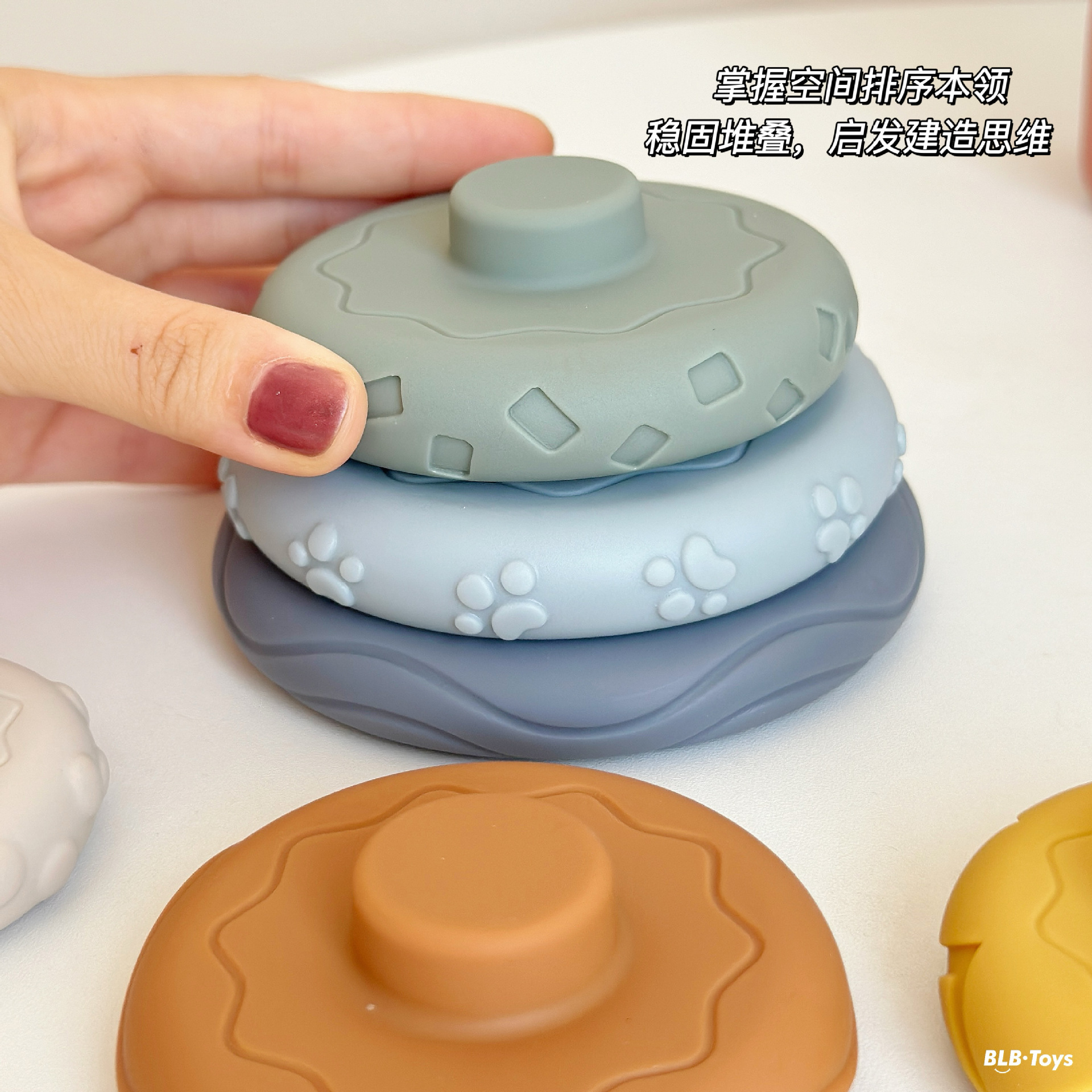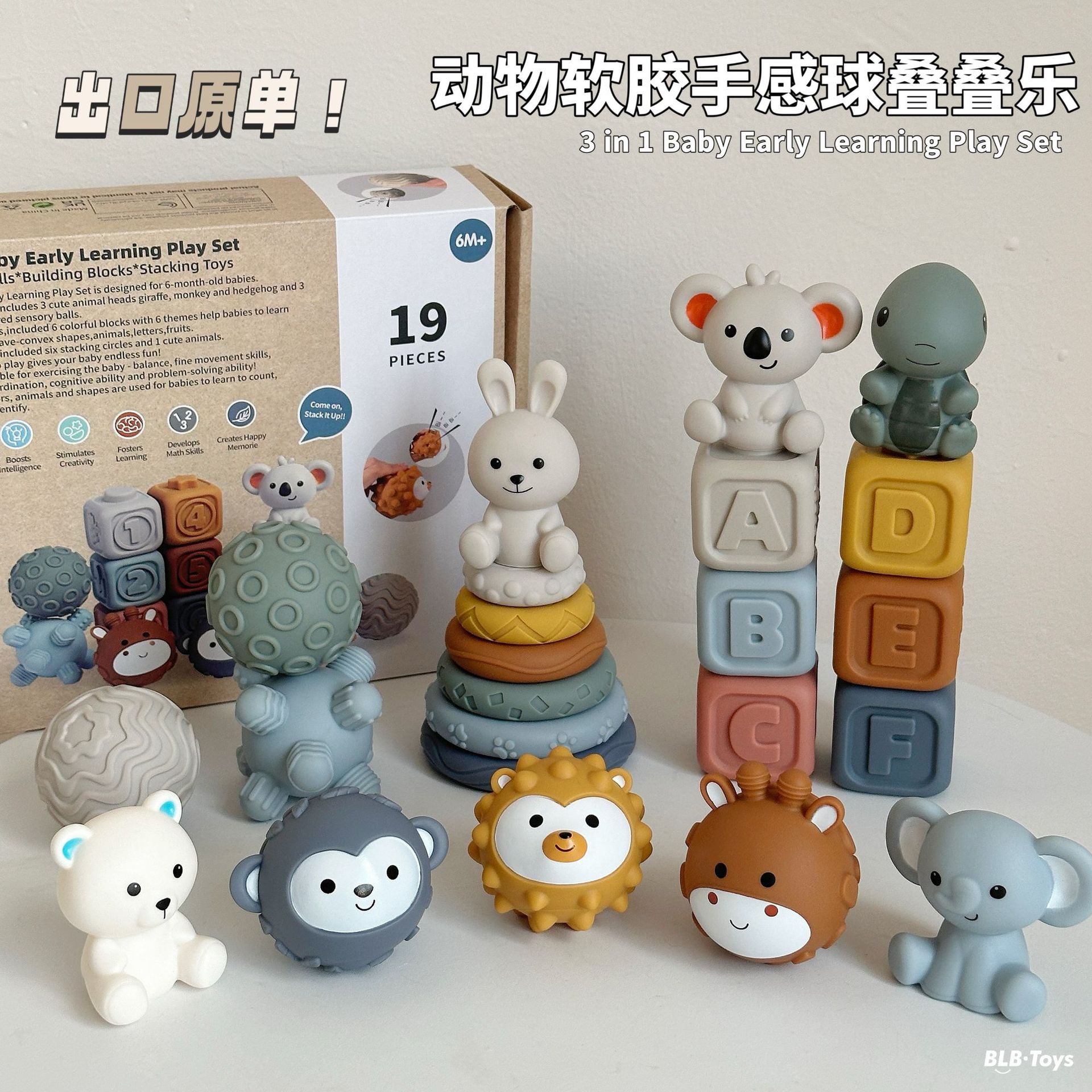 국경 간 신제품 아기 핸드 헬드 볼 장난감 부드러운 고무 스퀘어 빌딩 블록 스태킹 링 베이비 핀치 스태킹 핸드 헬드 볼스토어 가기
