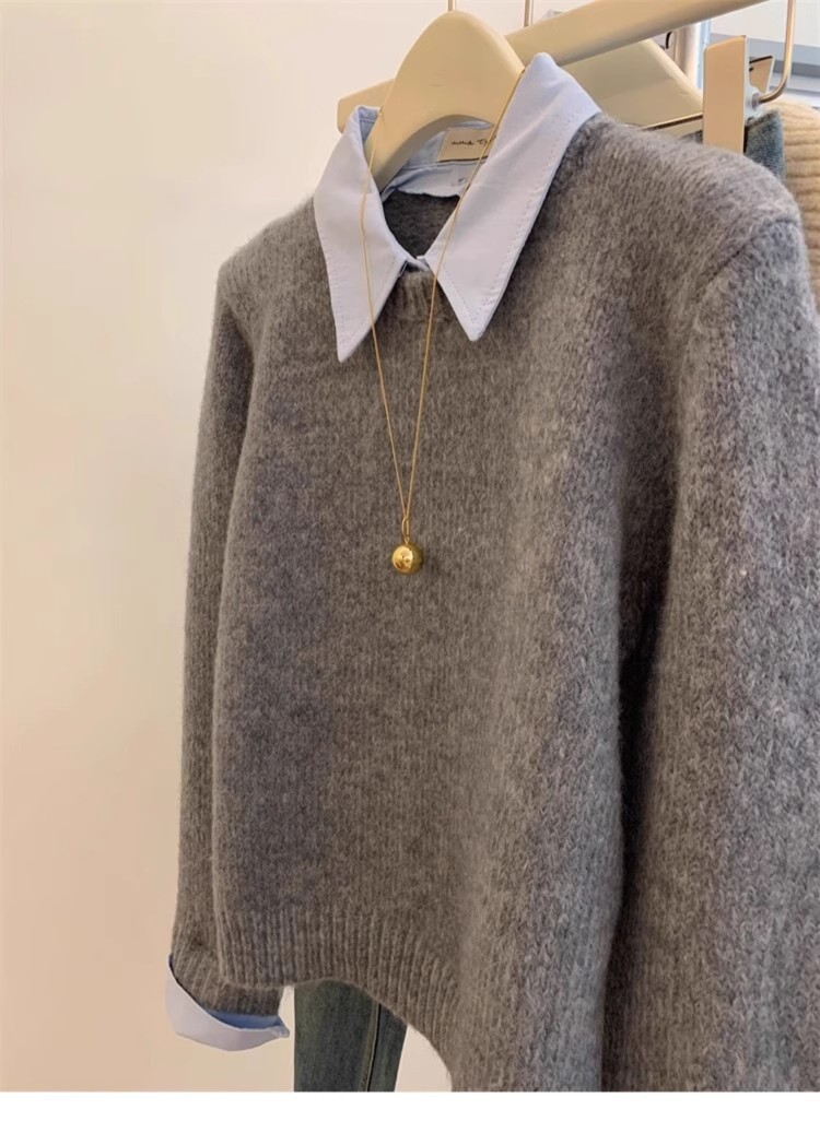 KANING 그레이 가짜 투피스 풀오버 스웨터 여성 가을 2025 새로운 폴로 칼라 긴팔 스웨터 내부 레이어