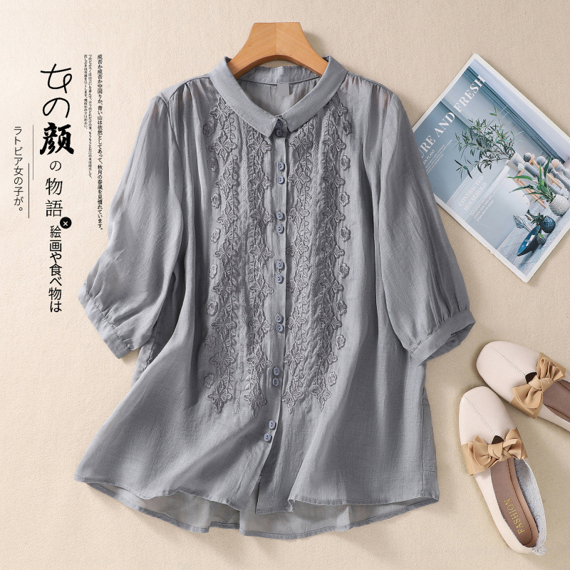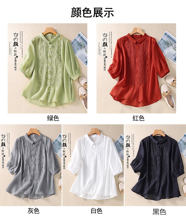 리얼 샷 2024 여름 새로운 자수 꽃 느슨한 예술적 7 점 소매 셔츠 여성용 셔츠 탑 #8360
