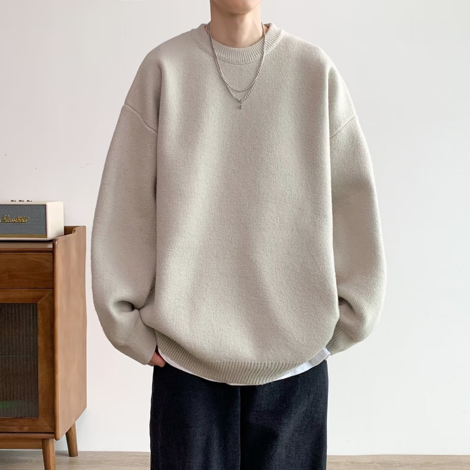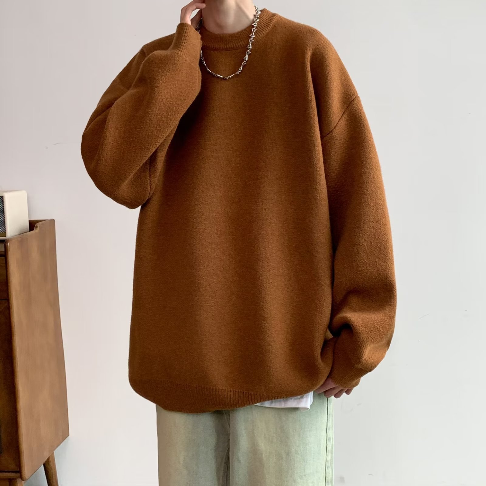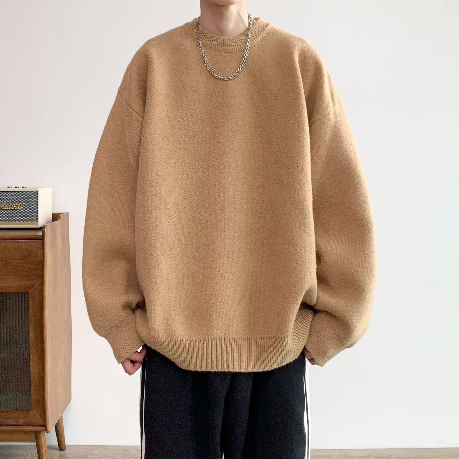 솔리드 컬러 스웨터 남자의 가을과 겨울 2024 새로운 클린 핏 니트 스웨터 미국 스타일 게으른 스타일 느슨한 둥근 목 재킷