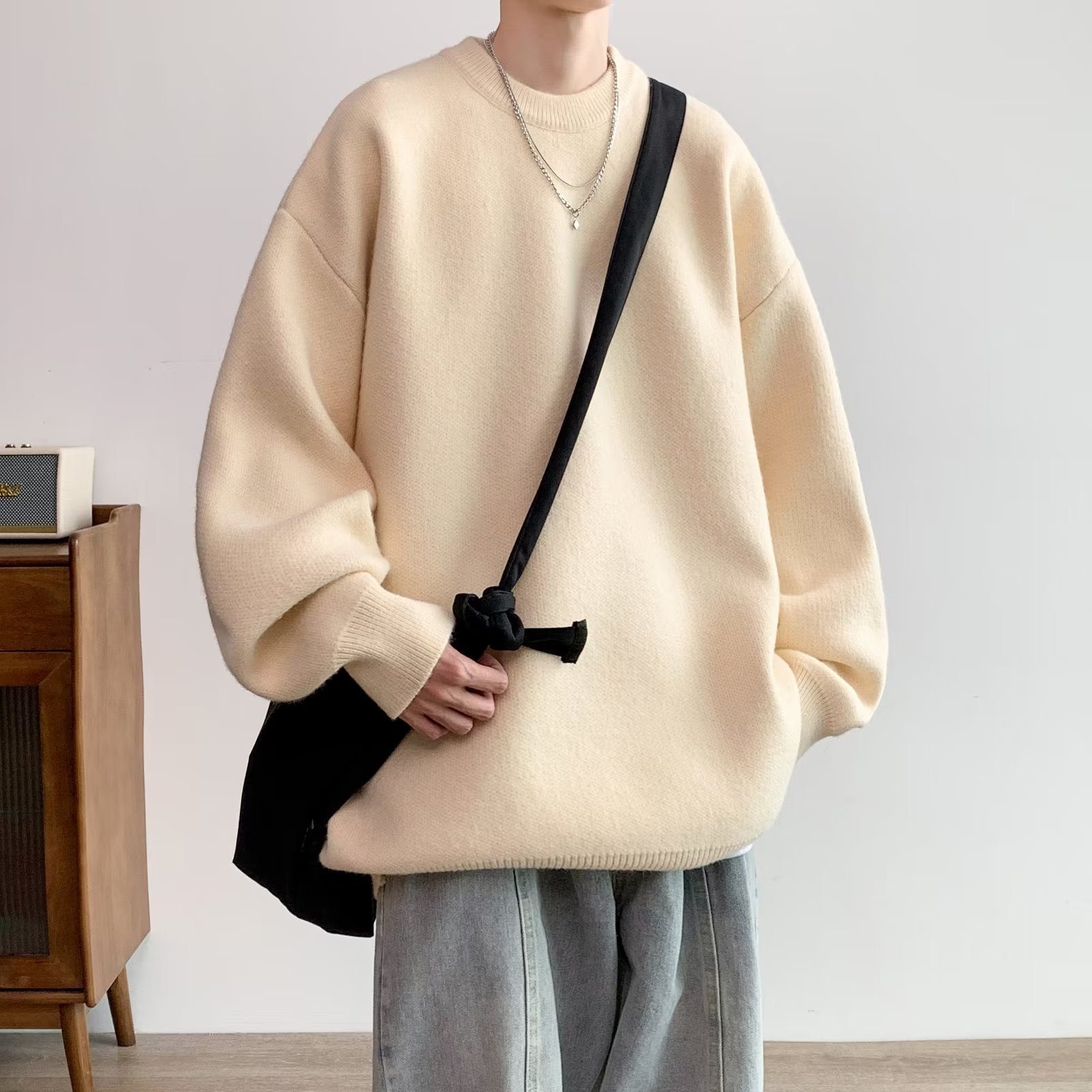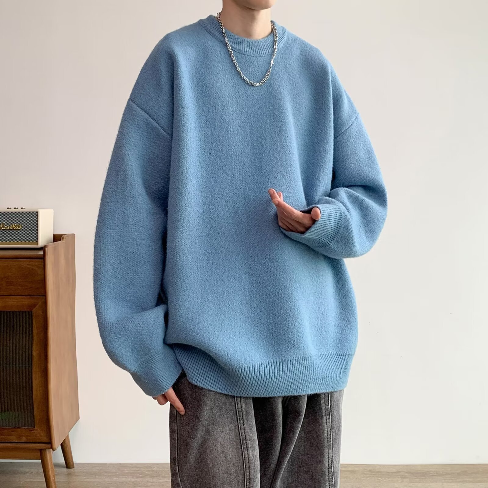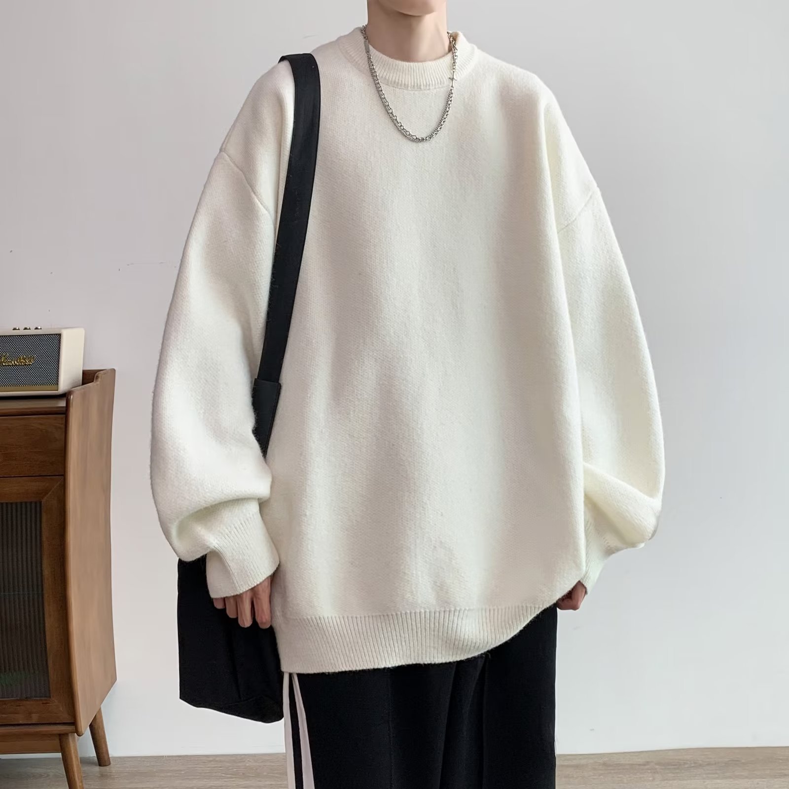 솔리드 컬러 스웨터 남자의 가을과 겨울 2024 새로운 클린 핏 니트 스웨터 미국 스타일 게으른 스타일 느슨한 둥근 목 재킷