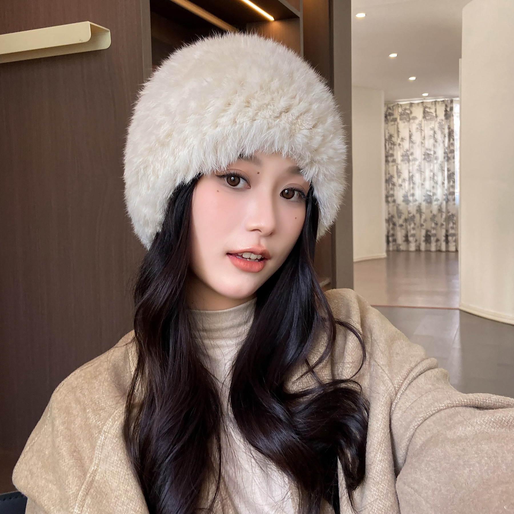 진짜 토끼 모피 모자 여자 가을 겨울 따뜻한 한국 스타일 올 매치 모피 모자 귀 보호 봉제 니트 라운드 모자스토어 가기