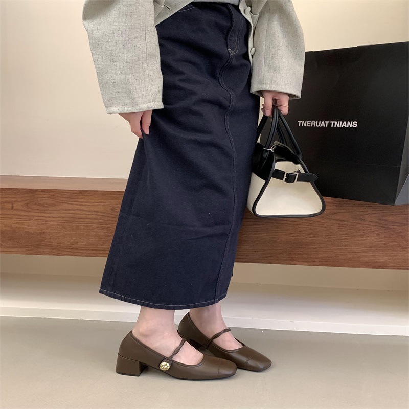 레트로 스퀘어 헤드 다크 브라운 청키 힐 얕은 입 싱글 신발 밀크 신발 여성의 봄과 가을 부드러운 요정 블랙 통근자 메리 제인 신발스토어 가기