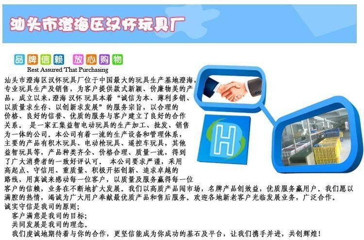 若个别商品存在严重质量问题,影响了产品的使用,请在收到货后3天内提出,我司将根据实际情况安排解决。如提供配件可以解决的,就将在客人下次进货时将配件和所订的货一起寄出;如需整个产品寄回才可解决问题的,请寄回完整的产品,但来回的运输费用由客人承担,寄回的产品等客人下次订货时和该产品一起寄出。由于玩具产品的特殊性,和家电产品不能相提并论,因此我司所有售出的玩具产品均不实行三包政策,如属使用后产生的问题,我司不承担任何责任,如在我司能力范围内,会帮助解决这些问题,但所产生的一切相关费用由客人自行承担。特殊产品按我司客服人员与客人达成的相关协议办理。