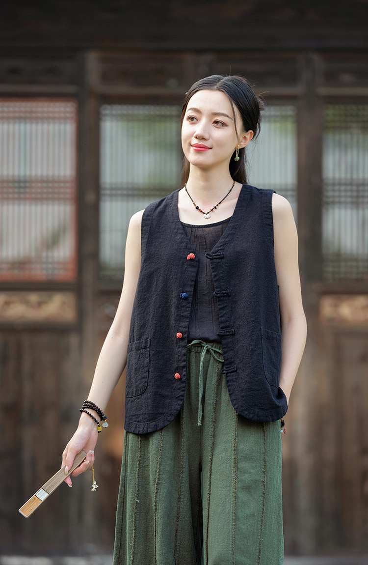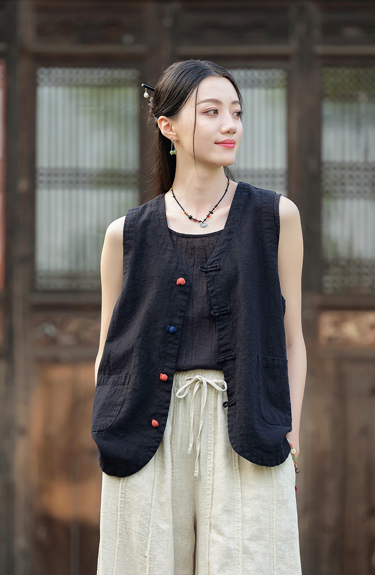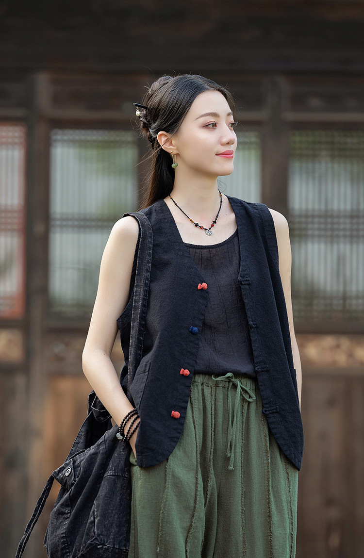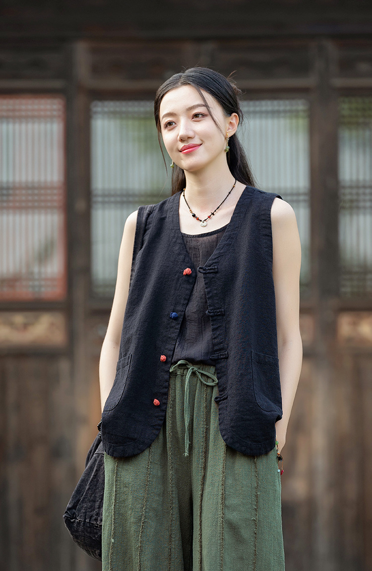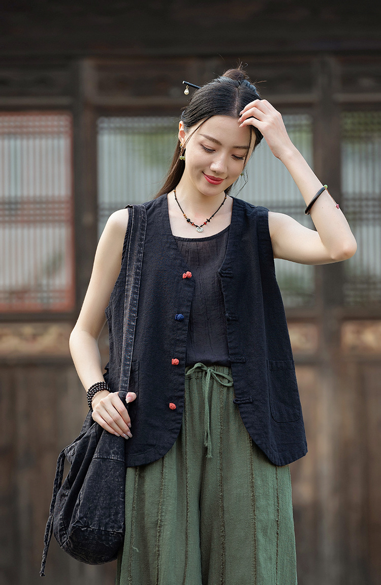 25 가을 새로운 오리지널 중국 스타일 복고풍 국가 스타일 대비 색상 버튼 코튼과 린넨 탑 조끼 카디건 여성용 양복 조끼스토어 가기