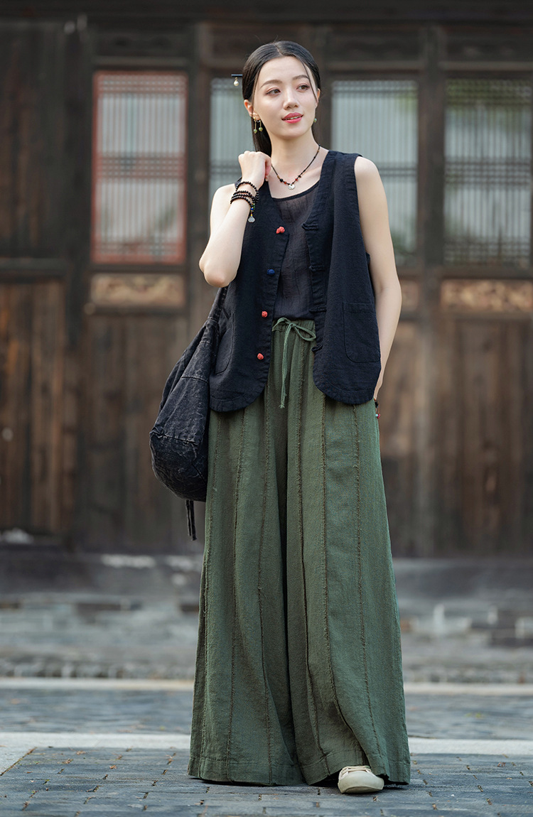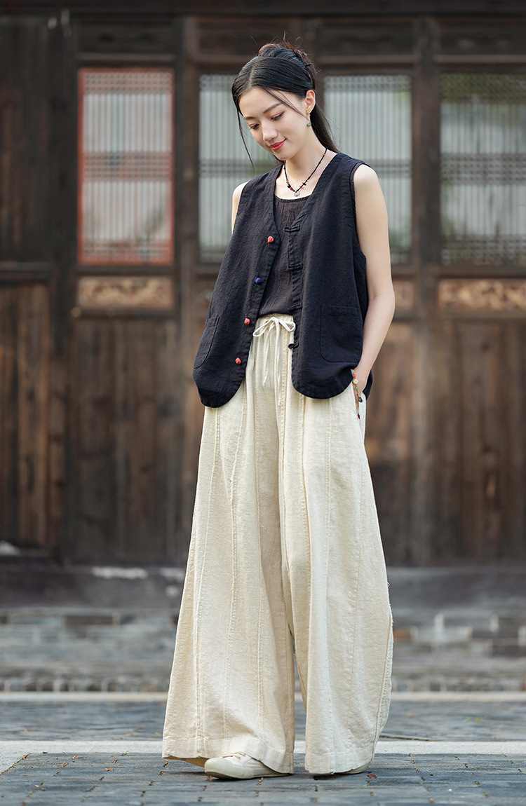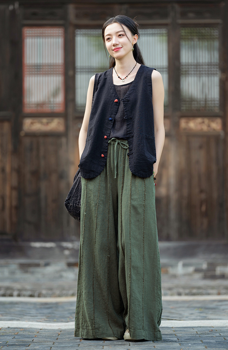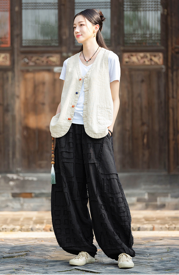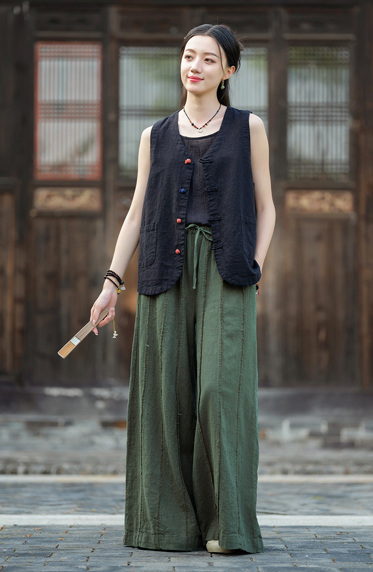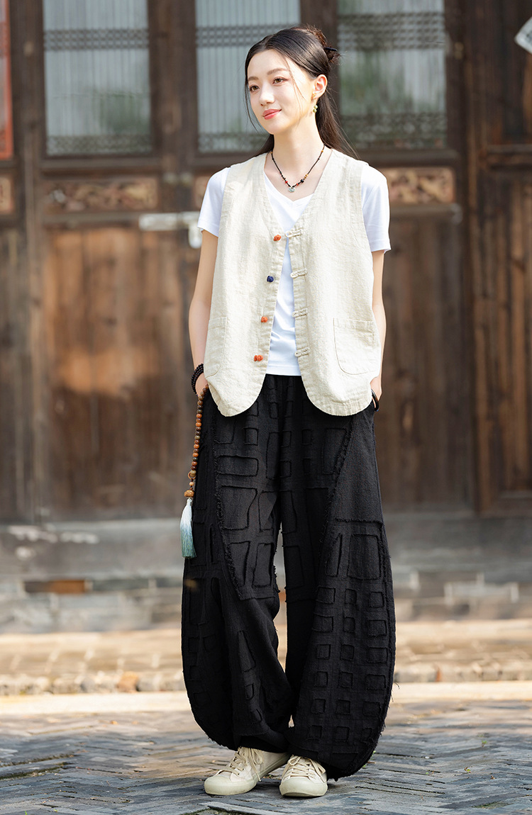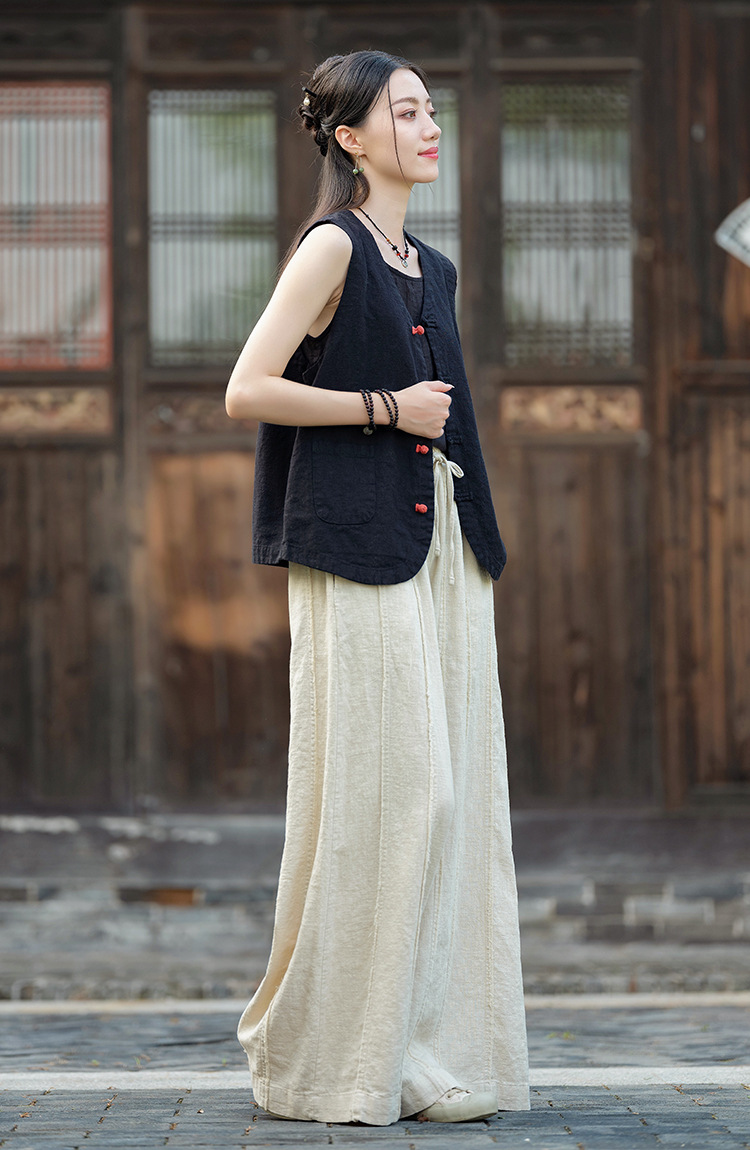 25 가을 새로운 오리지널 중국 스타일 복고풍 국가 스타일 대비 색상 버튼 코튼과 린넨 탑 조끼 카디건 여성용 양복 조끼
