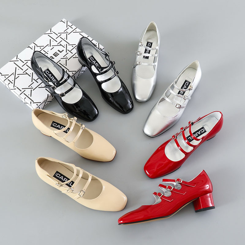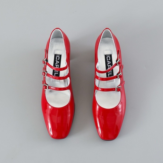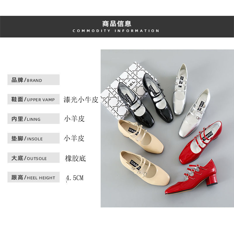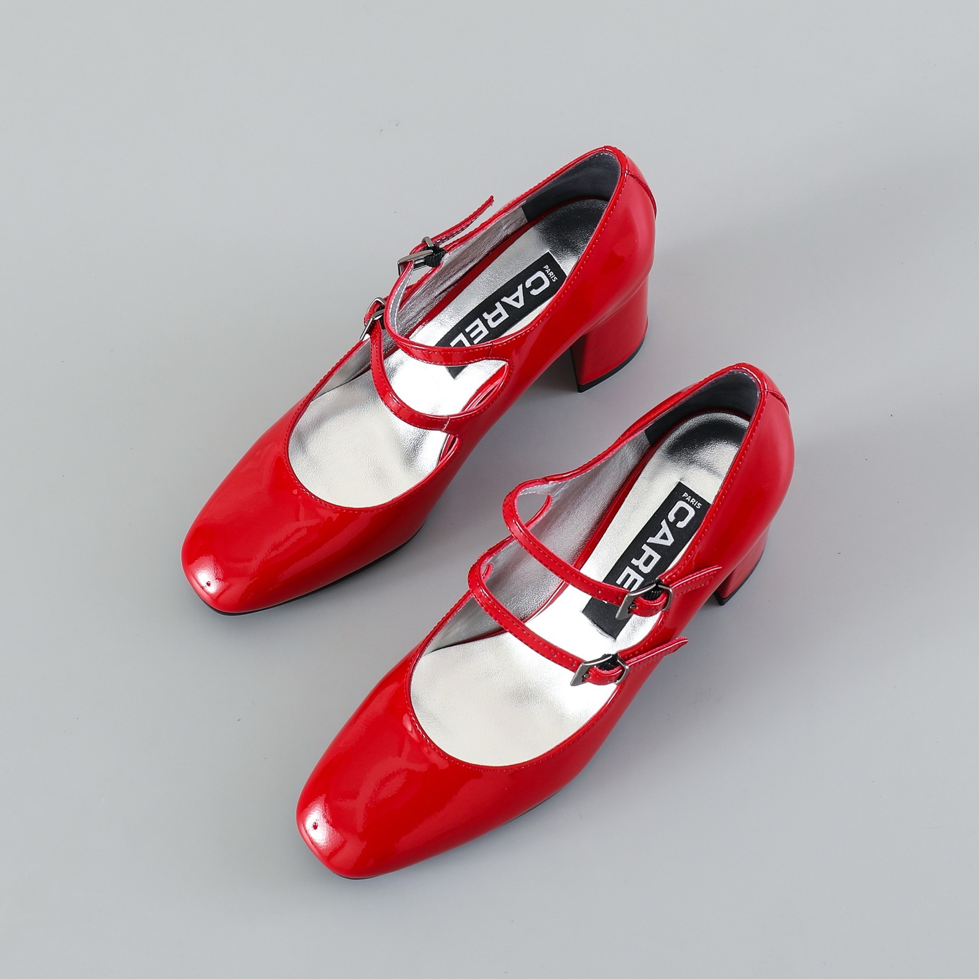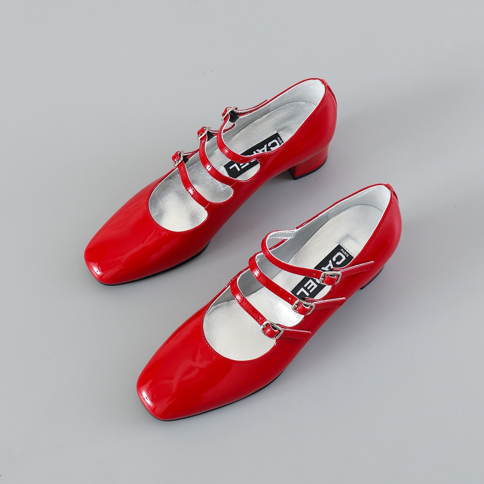 틈새 순수 오리지널 카렐 프랑스 스타일 빈티지 메리 제인 신발 여자 3 방향 벨트 두꺼운 미드 힐 싱글 레이어 신발 밝은 가죽 레드 웨딩 슈즈스토어 가기