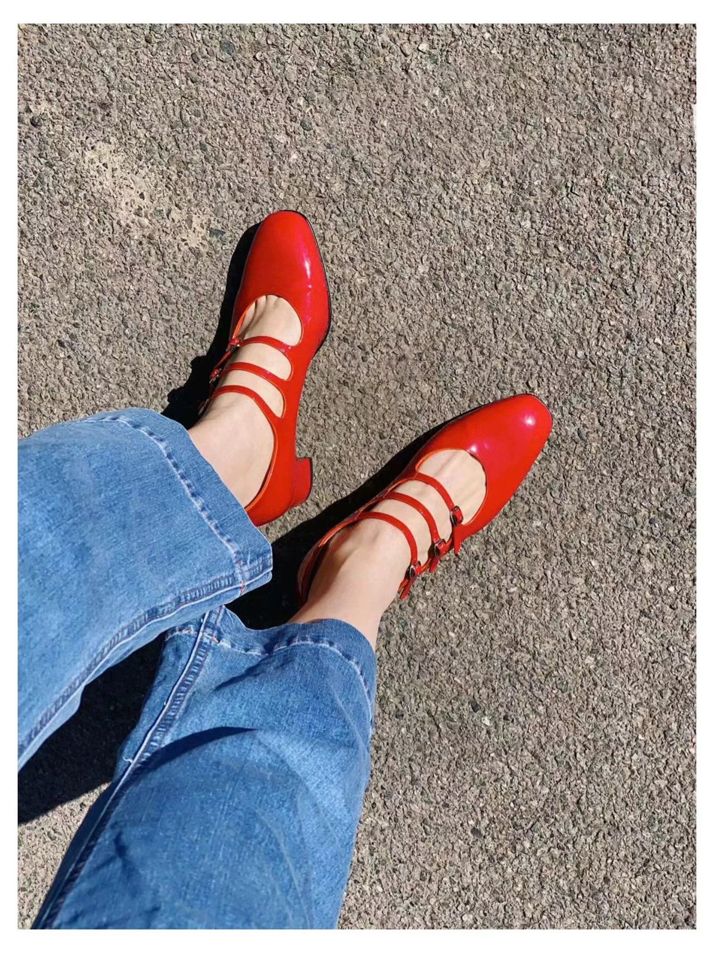틈새 순수 오리지널 카렐 프랑스 스타일 빈티지 메리 제인 신발 여자 3 방향 벨트 두꺼운 미드 힐 싱글 레이어 신발 밝은 가죽 레드 웨딩 슈즈